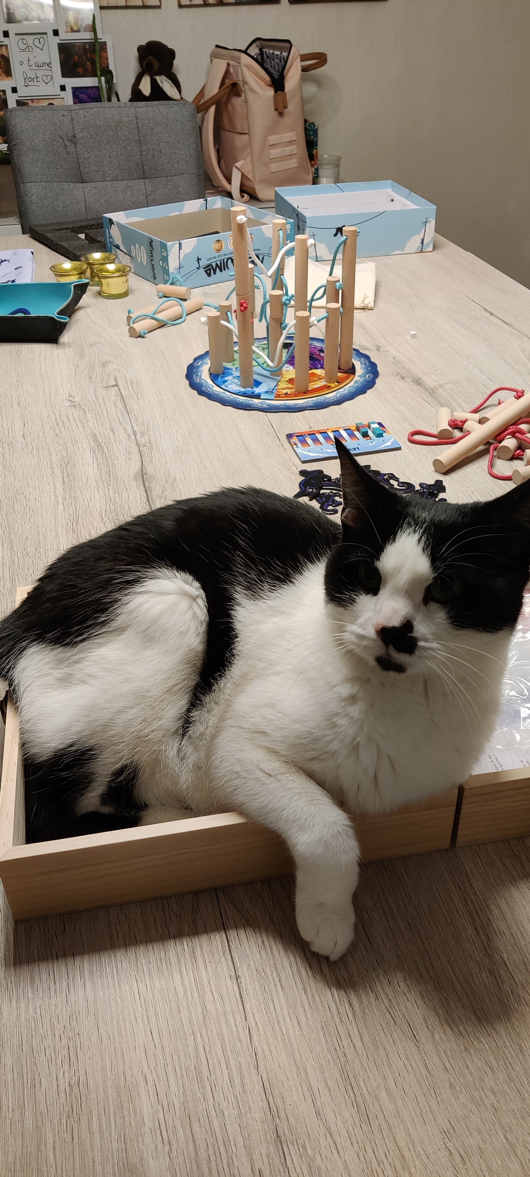 Du coup première partie a 2…3 plutôt, le chat a tout de suite compris a qui cette belle boîte était réellement destinée !
