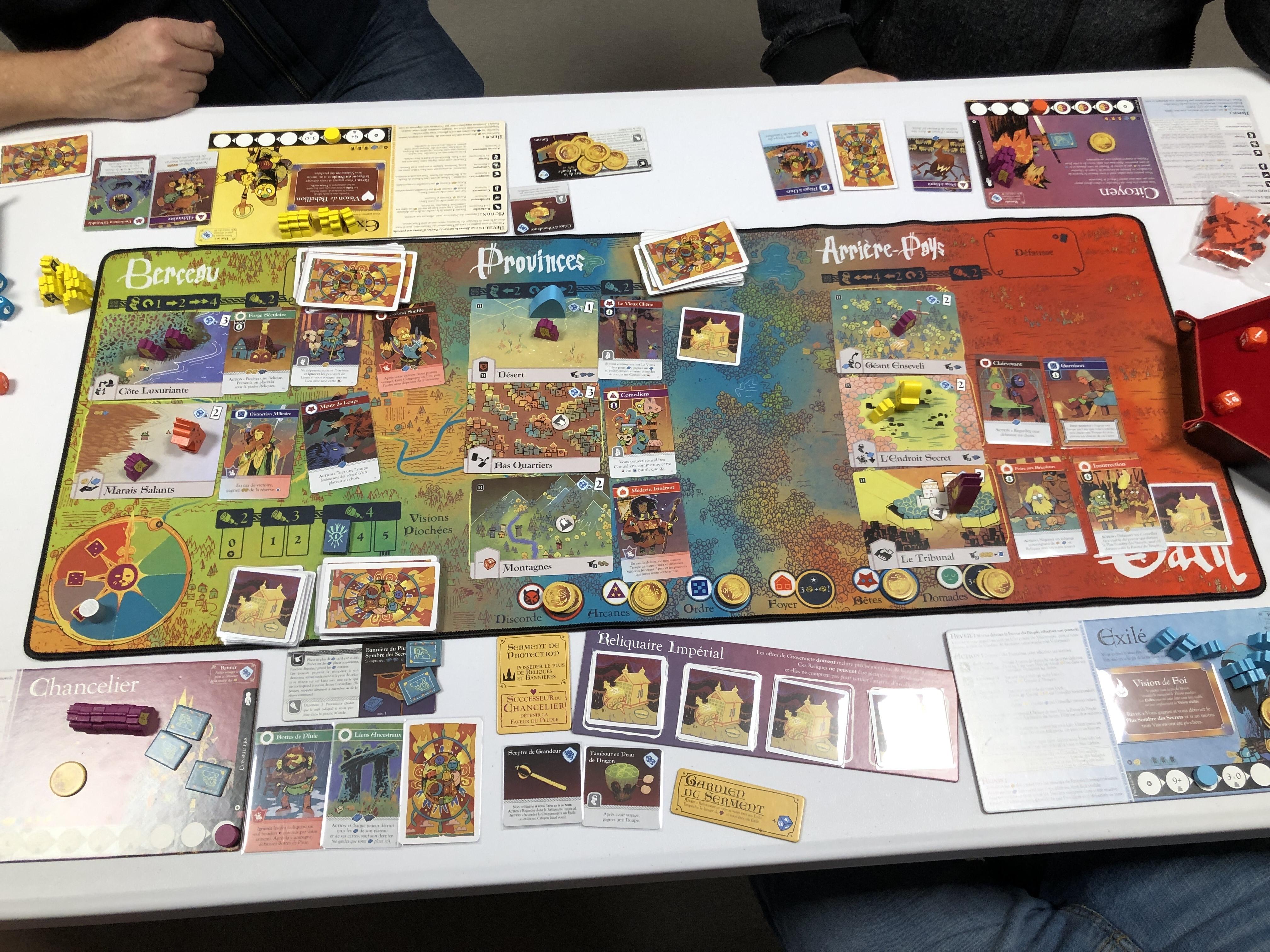 L’Exilé Rouge part sur la collecte des Reliques et l’Exilé bleu sur la bannière du Sombre Secret. Pour ma part (Exilé Noir) la seule Vision que j’arrive à piocher est le Complot… bon on va faire avec. Je pars dans l’objectif de rassembler une grosse armée pour m’emparer de la bannière du Peuple soit par la force soit avec mon Complot pour devenir Usurpateur.