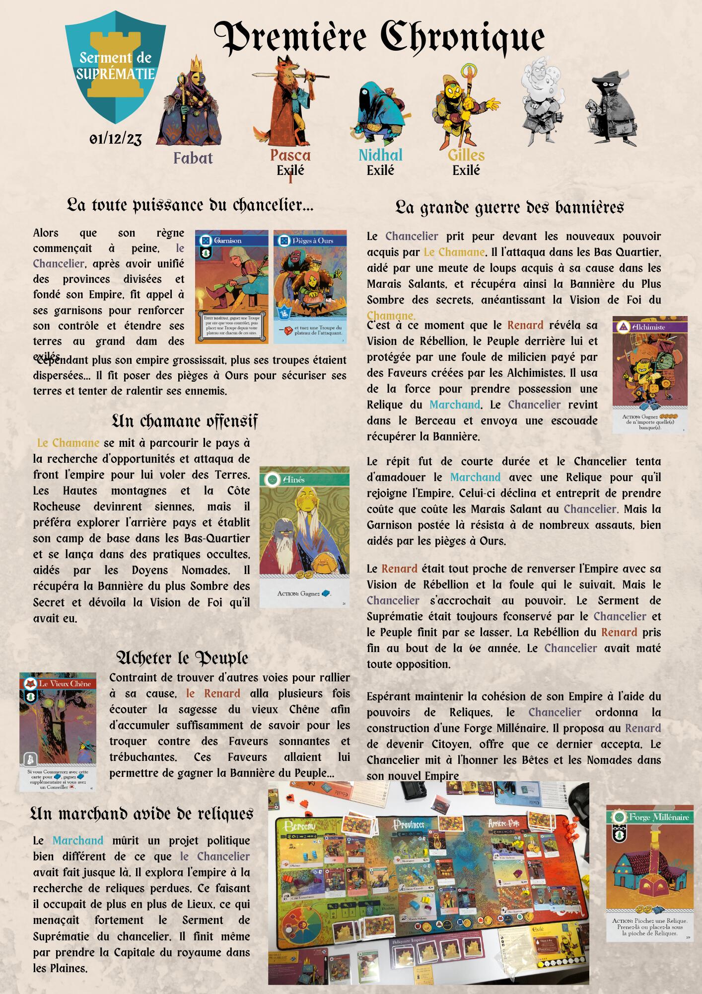 J’ai fait 10 parties de oath de mi 2022 à mi 2023, et c’est dans mon top des meilleures expériences ludiques. J’ai déjà dit moult compliments sur ce jeu, mais ce qui m’impressionne vraiment le plus c’est à quel point c’est un moteur à histoire exceptionnel. C’est pas narratif, cest pas du RP… mais il y a vraiment une histoire qui se raconte à chaque fois. Faire les comptes rendus a été un bonheur à chaque fois. On a pris le parti pris de dire que c’est le chancellier de la partie qui la raconte, qu’il ai gagné ou pas. Découvrir les histoires écrites par les autres a été a chaque fois un vrai bonheur. Avec mon groupe, ça a été une « mécanique » vraiment importante, et je pense qu’il ne faut pas la considérer facultative !