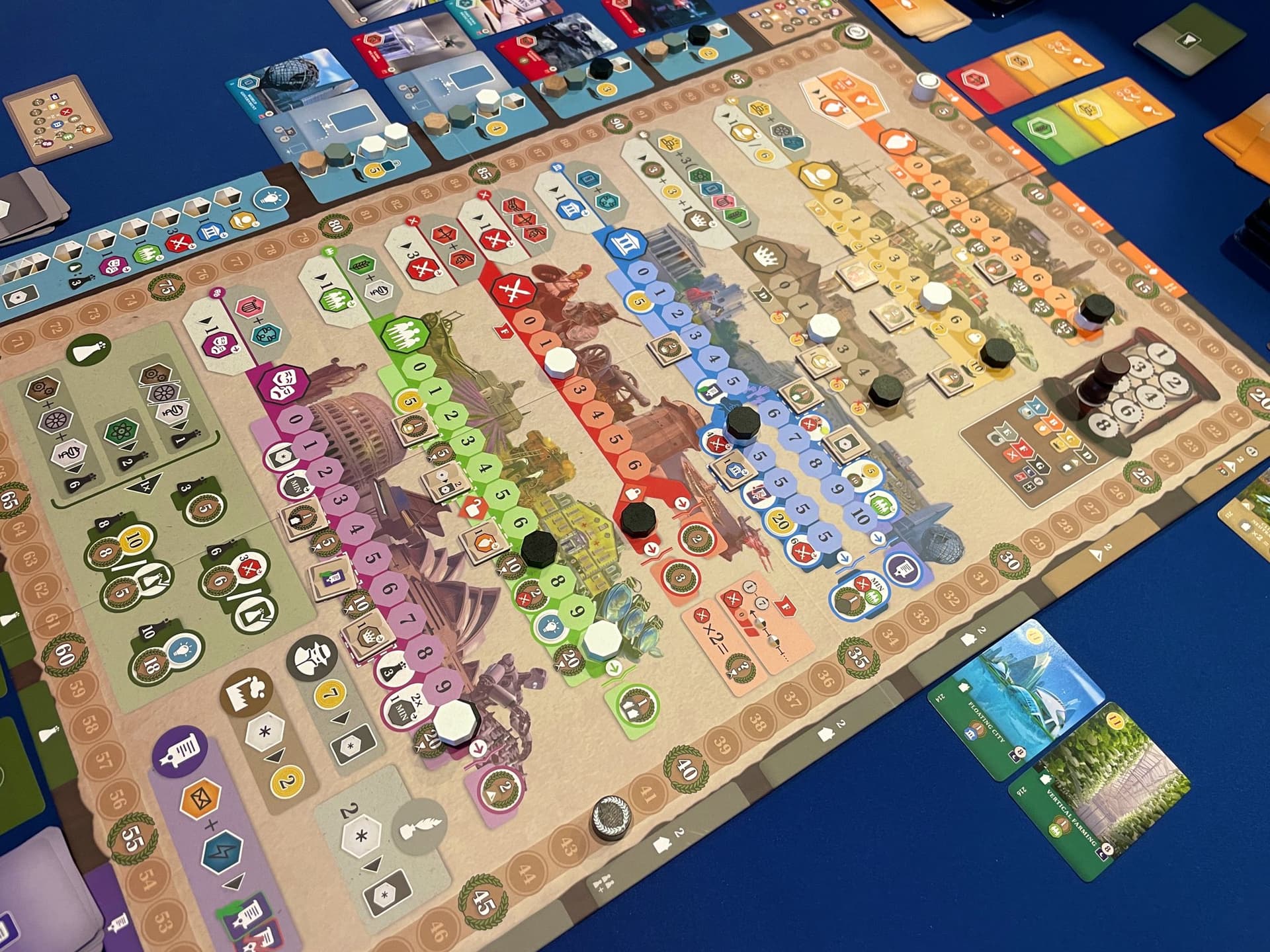 On a un peu galéré pour la mise en place initiale car le jeu a beaucoup de cartes différentes, et s’étale vraiment sur toute notre table : il y a des cartes à placer de part et d’autre du plateau. Autant avec Ark Nova ça passe à 2, là, on a dû décaler le plateau sur le côté pour poser nos cartes au centre de la table.