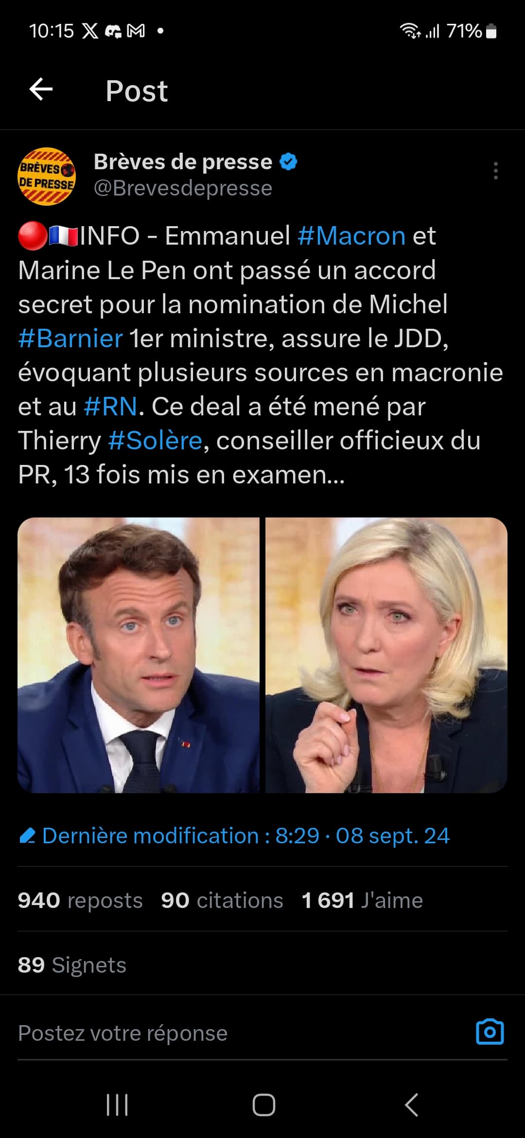 De toute manière, avec ou sans Barnier, le Front Républicain, c’est mort. Va expliquer aux candidats / électeurs de gauche qui se sont retirés ou qui ont voté Borne et consorts pour éviter le RN et qui voit Macron appeler Le Pen et nommer Barnier (qui représente quoi ? Qui ? Sur quel programme ?) en t’expliquant que la Gauche (en dépit du résultat sorti des urnes) même sans Mélenchon ni ministres LFI c’est non pour le bien du pays et des institutions de renouveler l’expérience en 2027.
