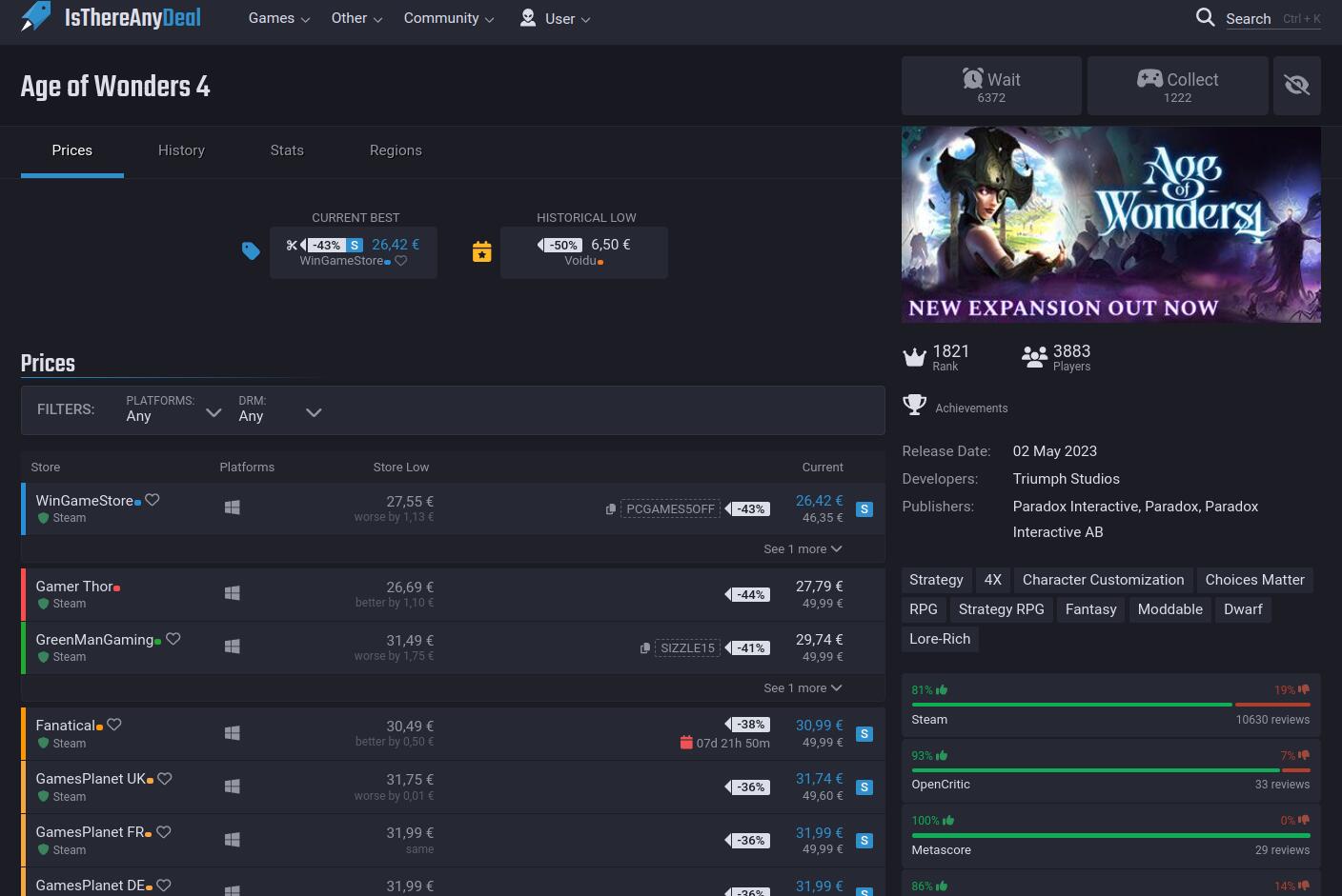 Mhh pour les jeux vidéos il faut regarder sur « IsThereAnyDeal » (çà montre tous les prix toutes boutiques confondues, çà choppe vos « wishlist » de Steam pour faire du tracking (si vous le souhaitez) et envoyer un mail, etc.)