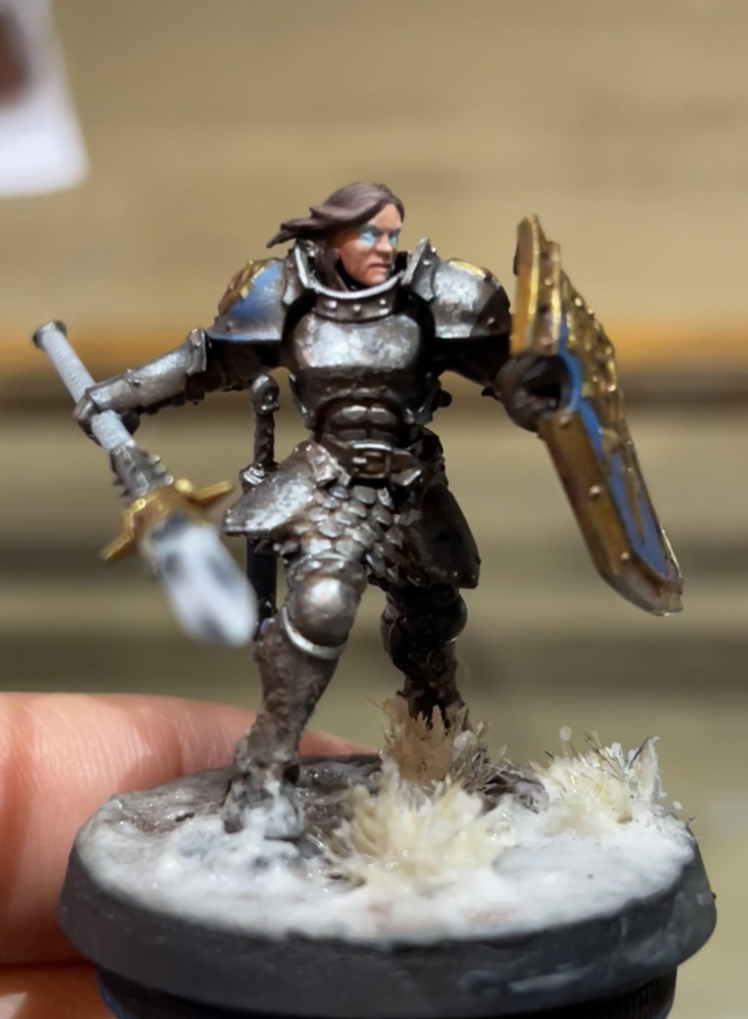 Deux réponses : si tu veux reprendre ta lame, et que tu es toujours en mode expérimentation, pourquoi ne pas partir sur quelque chose de complètement différent ? Quelqu’un a présenté il n’y a pas longtemps toute une escouade avec des lames qu’on aurait dit forgé dans la glace. Pourquoi ne pas t’essayer à un exercice analogue pour essayer de typer un peu plus ta figurine et te mettre un peu « en danger » ?