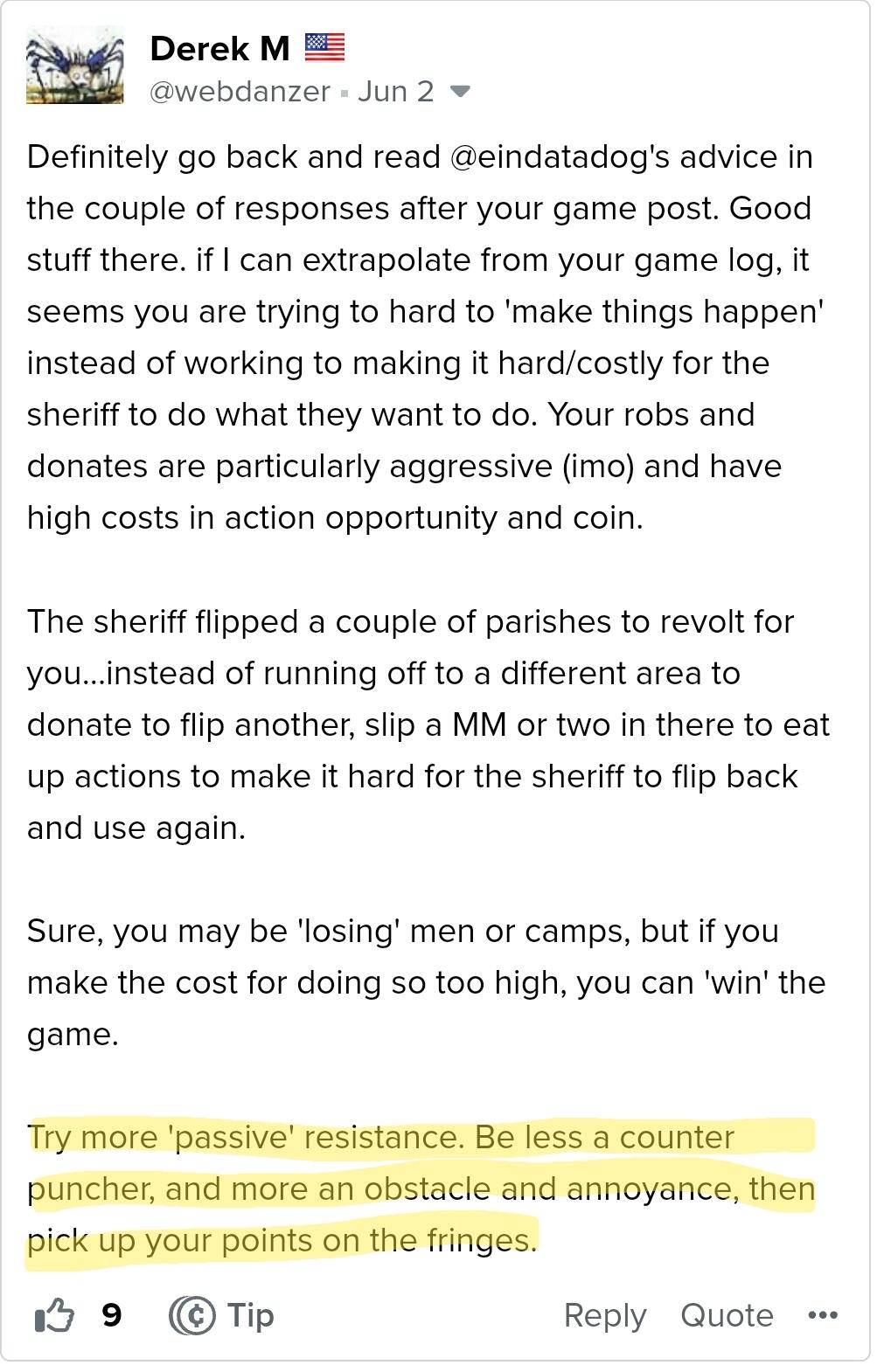Typiquement, il est clair qu’il faut arrêter les chariots mais je ne vois toujours pas comment faire si le shérif fait un minimum d’effort pour les protéger. Robin galère à rassembler 3-4 merry Men, or c’est presque le minimum pour attaquer sans trop de risque. C’est très visible, ça mobilise plein de ressources, le shérif a toutes les chances de contrer. Bref, je sèche.