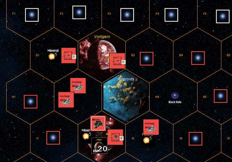 La phase de production est là encore très fluide, alors même qu’un premier coup d’oeil à la « Production Chart » ferait s’évanouir un habitué d’Excel. Les revenus sont la somme des points non dépensés du tour d’avant avec ceux rapportés par notre « homeworld » et nos colonies, et les éventuels minerais convoyés par nos « mineurs » vers nos bases. On enlève ensuite les coûts de maintenance de nos vaisseaux (égaux à la taille de leur coque), et ce qui reste peut être dépensé dans la construction de vaisseaux et la recherche de nouvelles techs.