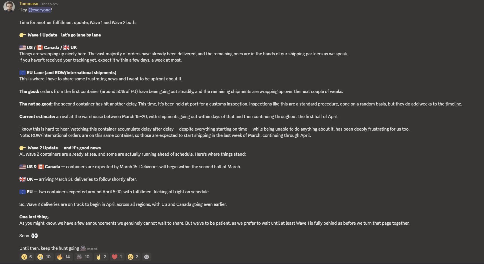 C’est un message sur leur discord. Ils communiquent beaucoup par l’intermédiaire de celui-ci mais clairement, pour les gens qui ne sont pas dessus, c’est un peu limite… (à moins qu’ils relaient les mêmes infos sur les réseaux sociaux mais vu que je ne suis pas dessus, aucune idée de s’ils le font).