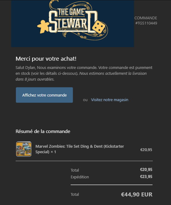 Donc avec les frais de port j’en ai pour 35euros. Ca me fait 55euros les tuiles pour zombicide marvel, ca va encore. Je m’attendais à un truc comme 30 balles. (Bon il me semble que j’ai pris un lot abimé pour ca que je le paie moins cher aussi…)