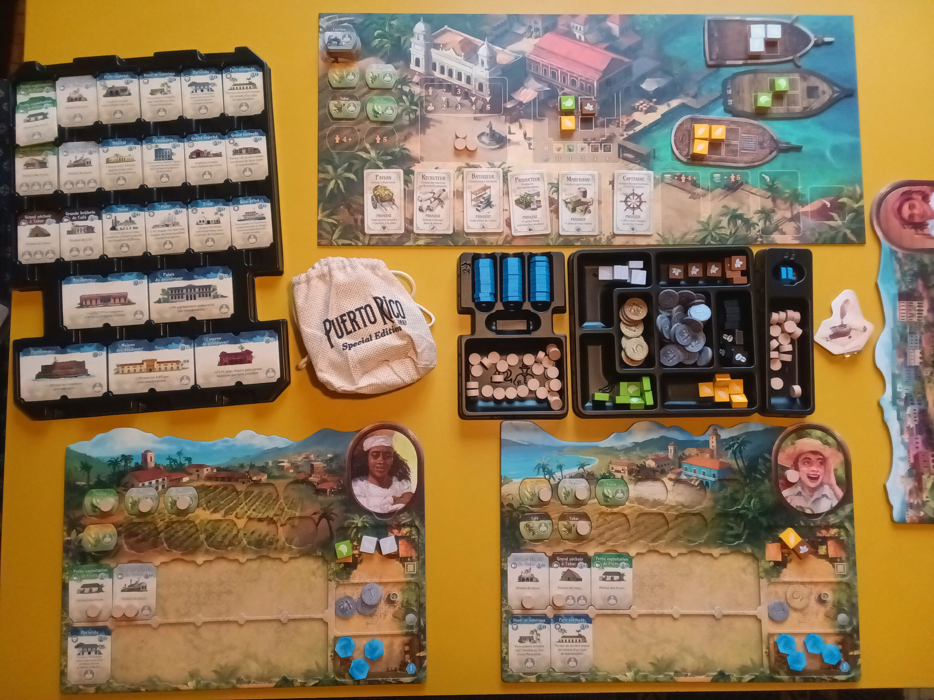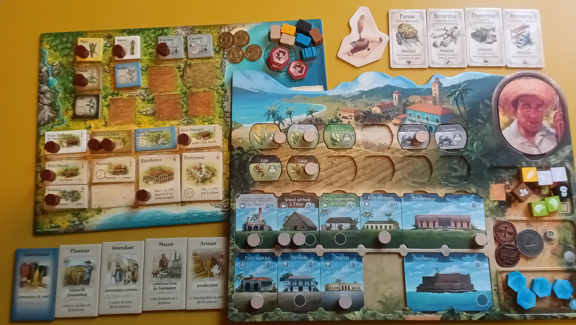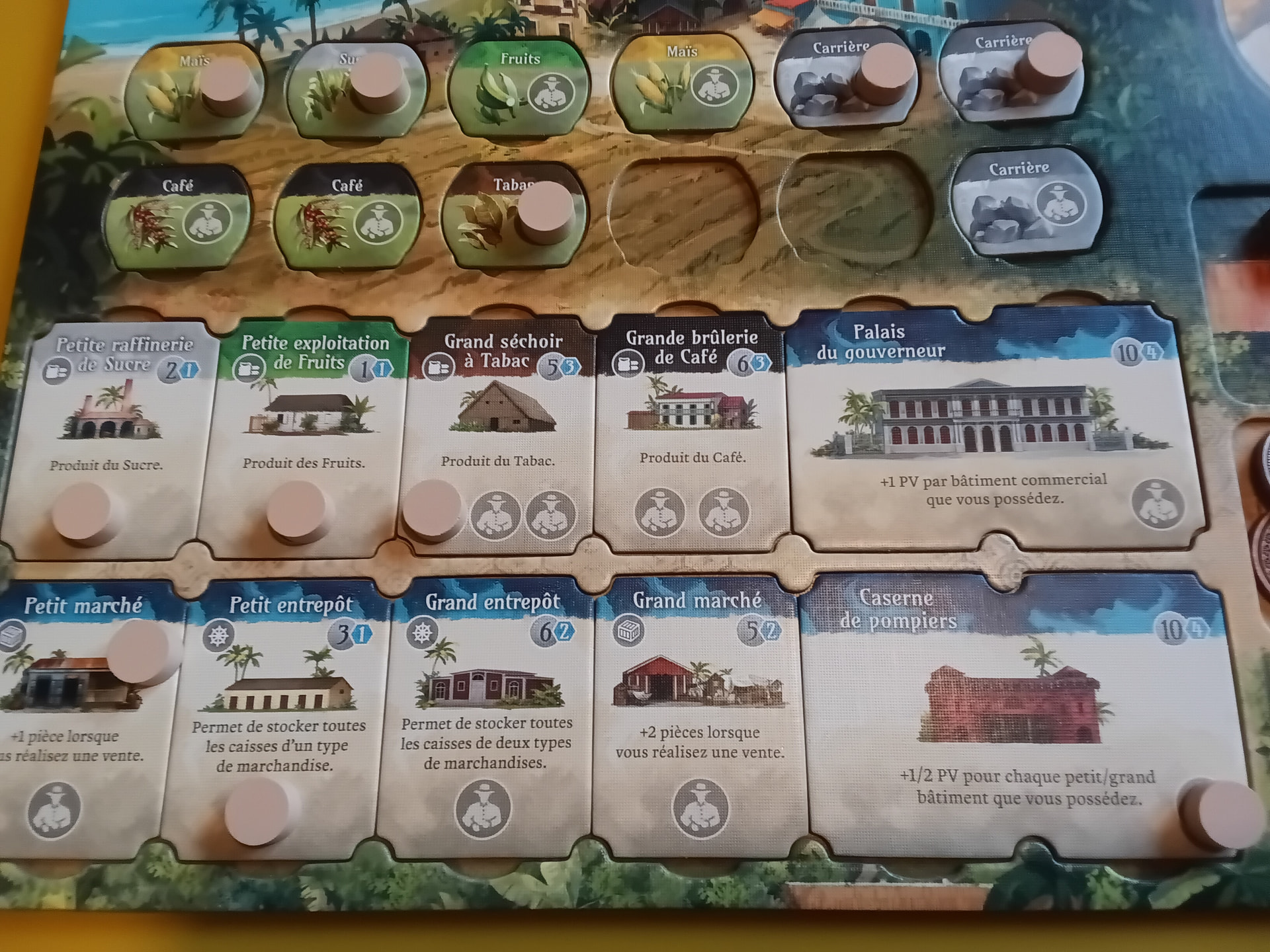 Dans Puerto Rico, vous incarnez un grand propriétaire terrien cherchant à faire prospérer ses domaines sur l’île de Porto Rico, après l’ère coloniale. Le jeu vous place au cœur d’un cycle économique : vous devez défricher des terres pour planter des ressources (café, tabac, maïs, sucre, indigo), construire des bâtiments de production et des infrastructures urbaines, puis exporter vos marchandises vers l’Europe pour gagner en prestige et en richesse.