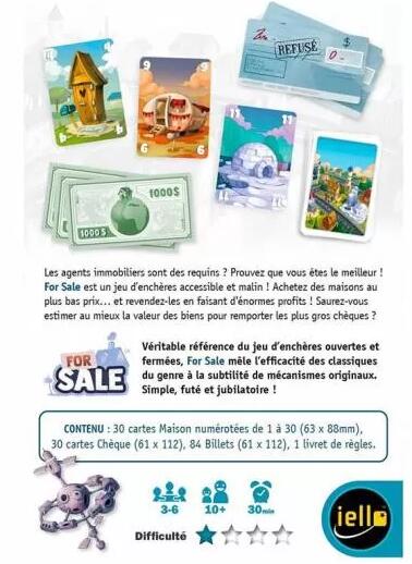 Essaie de détourner leur attention avec le jeu for sale dans la gamme des jeux pockets de iello. C’est un jeu d’enchères, où tu mises pour acheter des habitations plus ou moins chics (carton, cabane, maison, château …) que tu revends après pour essayer de faire le plus de profit. On manipule des dollars et des chèques !
