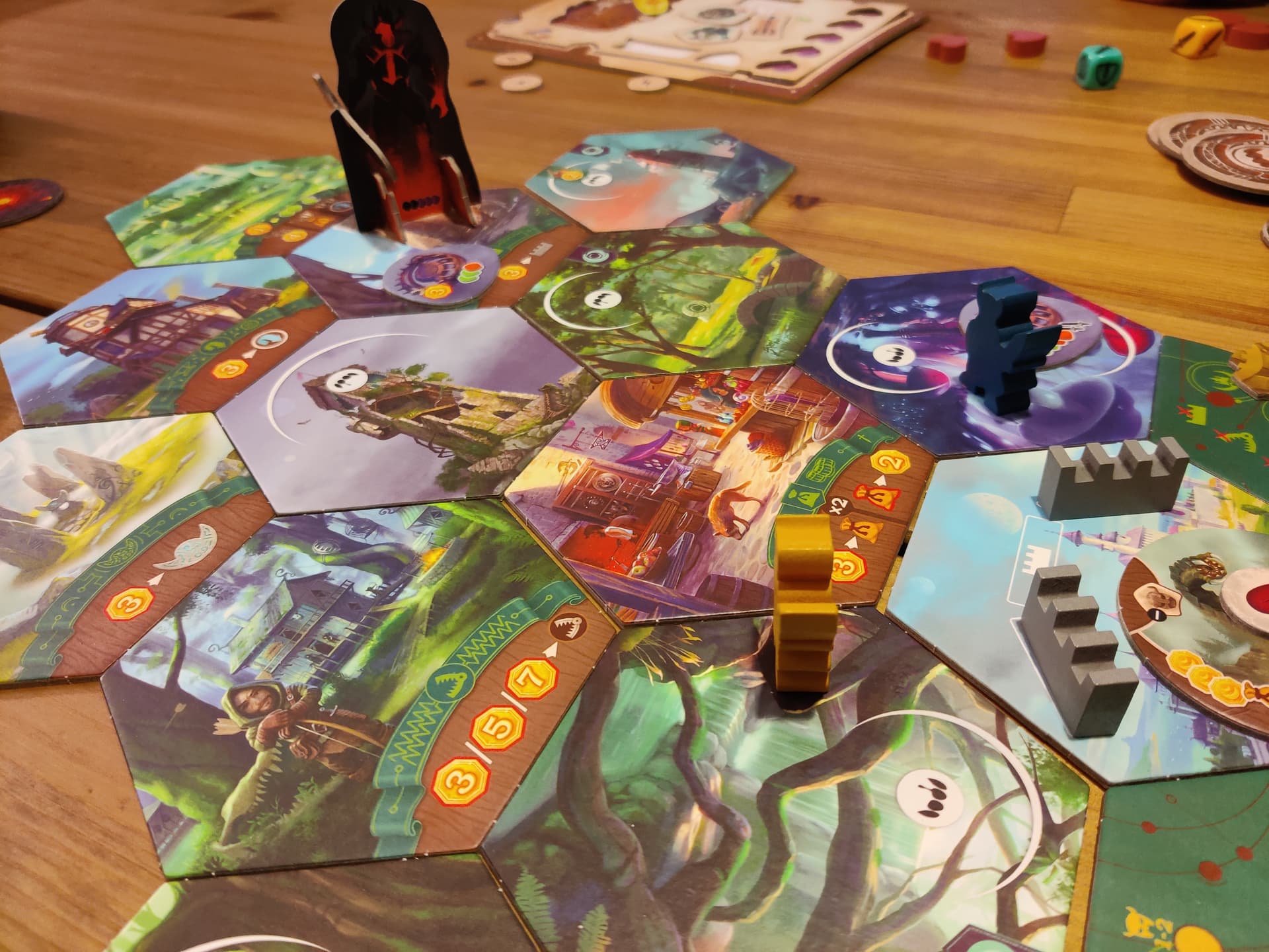 Le début de partie est classique : chasse aux petits monstres, loot. Nous trouvons assez rapidement les sceaux lunaires et réussissons à fermer deux tanières adjacentes au Château, ce qui nous met en confiance. À quatre joueurs, nous parvenons à explorer rapidement le plateau et nous répartir équitablement. Nous décidons également d’affronter les gros monstres mais sans les achever, en leur laissant un point de vie. En effet, lorsque la Lune Noire se lève, les monstres vaincus ne reviennent pas, et il devient possible d’achever en un tour deux monstres déjà bien abîmés.