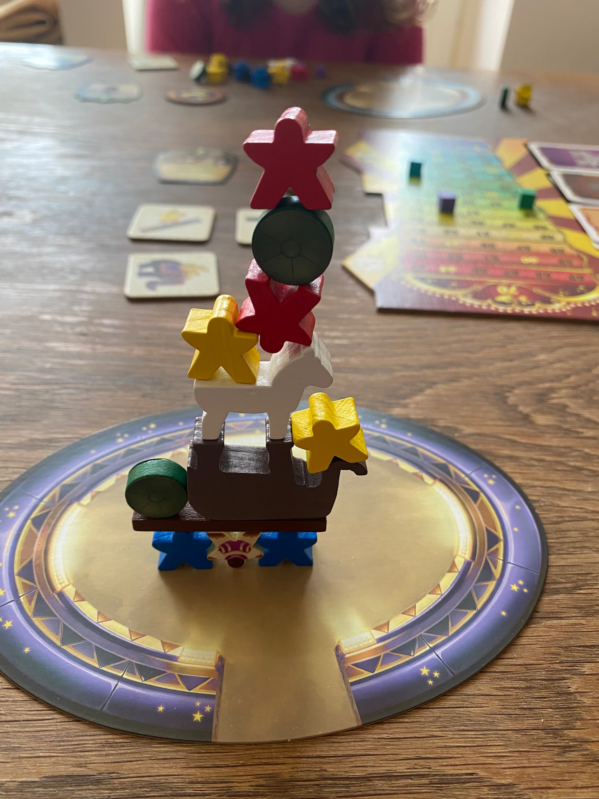 Pour ma gamine, le seul point négatif c’est le timer, hyper stressant quand elle n’arrive pas à faire tenir les meeple suivant son plan, donc pour l’instant on fait sauter le timer pour elle.