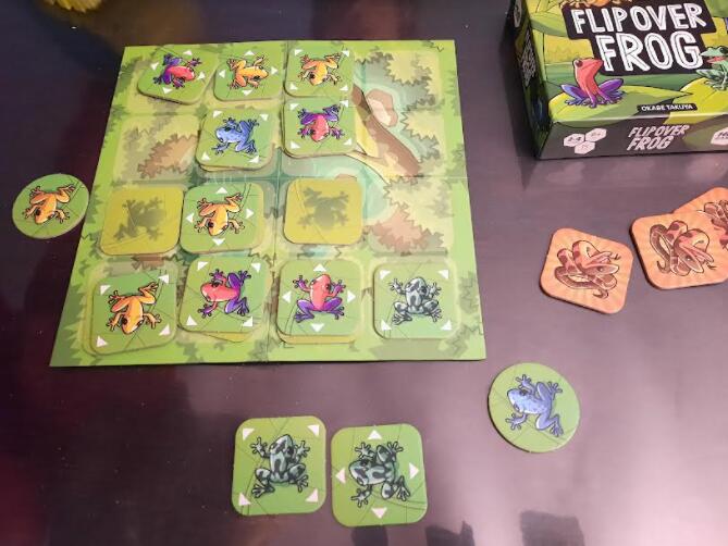Aujourd’hui 2 parties de Flip over frog, un petit jeu de prise de territoire acheté à 11 euros chez crowdfinder, pour compléter un ks et rentabiliser les fdp. 6 ans et + 2-4 joueurs, 15 minutes.