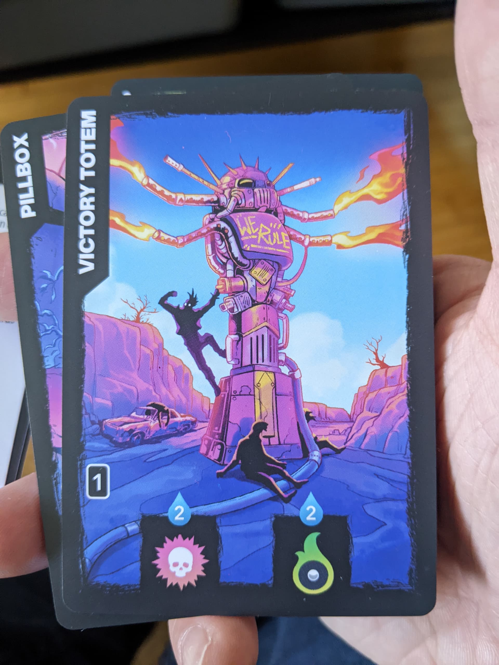 Tout ça soupoudré d’une bonne couche de chance avec le tirage de cartes dont certaines sont circonstancielles. Ce qui pour moi est la chose la plus importante du jeu : piocher, piocher et encore piocher. Limite une course pour choper le combo qui fera détruire les camps adverses.