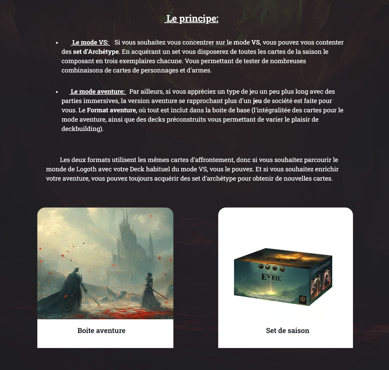 Au niveau de la proposition, je suis encore en réflexion, cependant, la boite tout inclut pour le mode aventure ainsi que deux archétypes (un peu comme les couleurs à Magic) est la direction envisagée. Ajoutez à cela des Sets d’archétype complets (4 prévus) pour le premier.