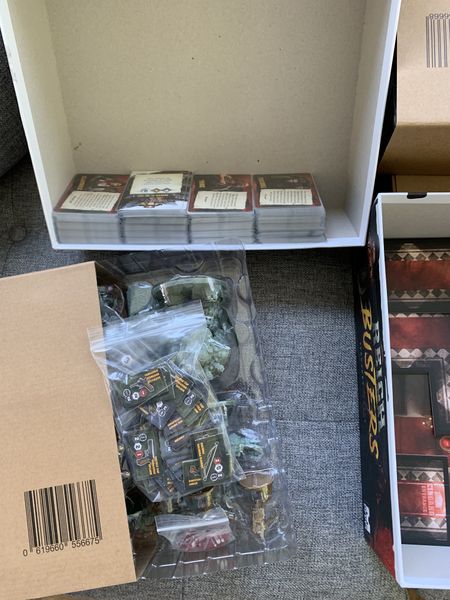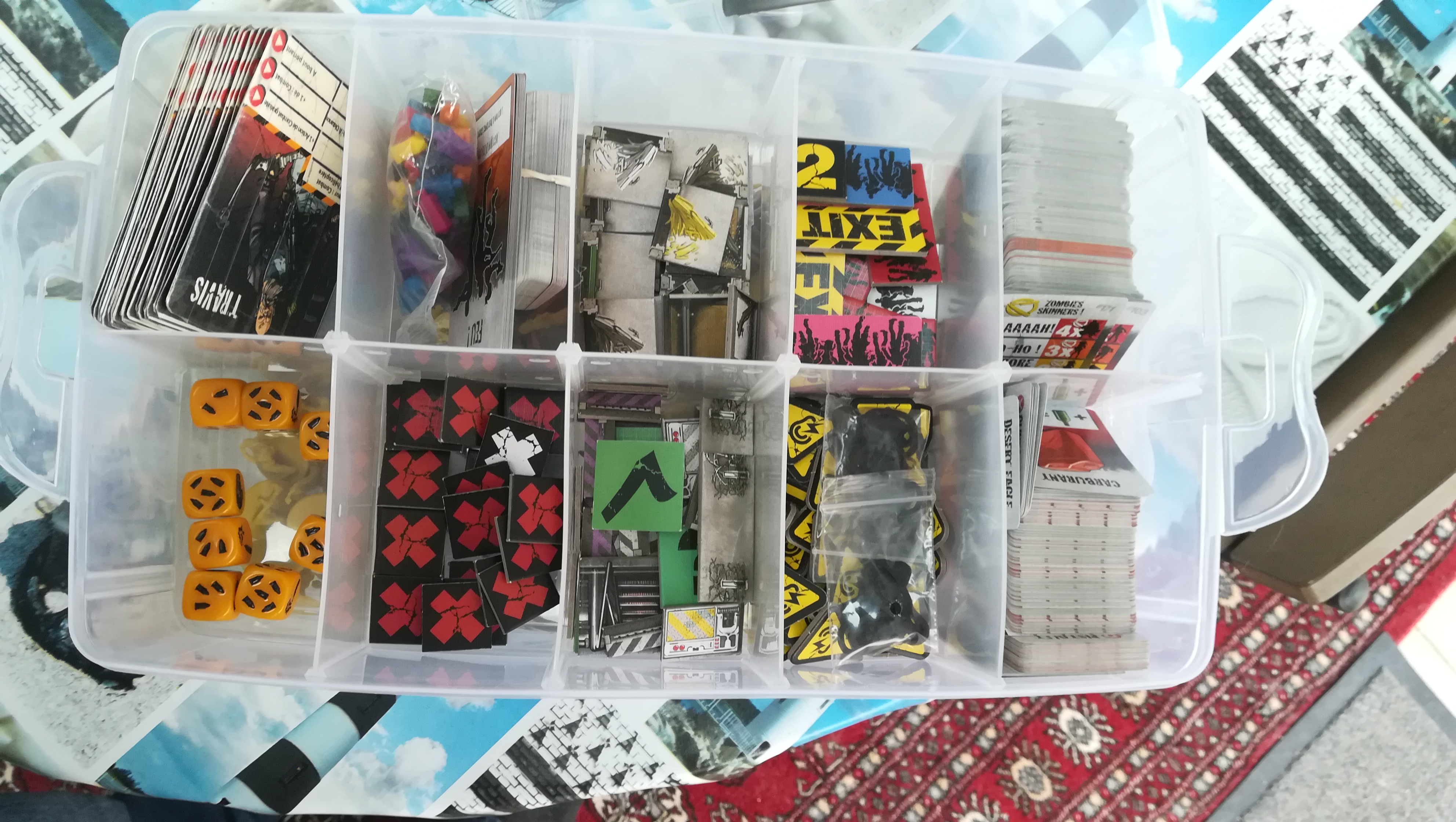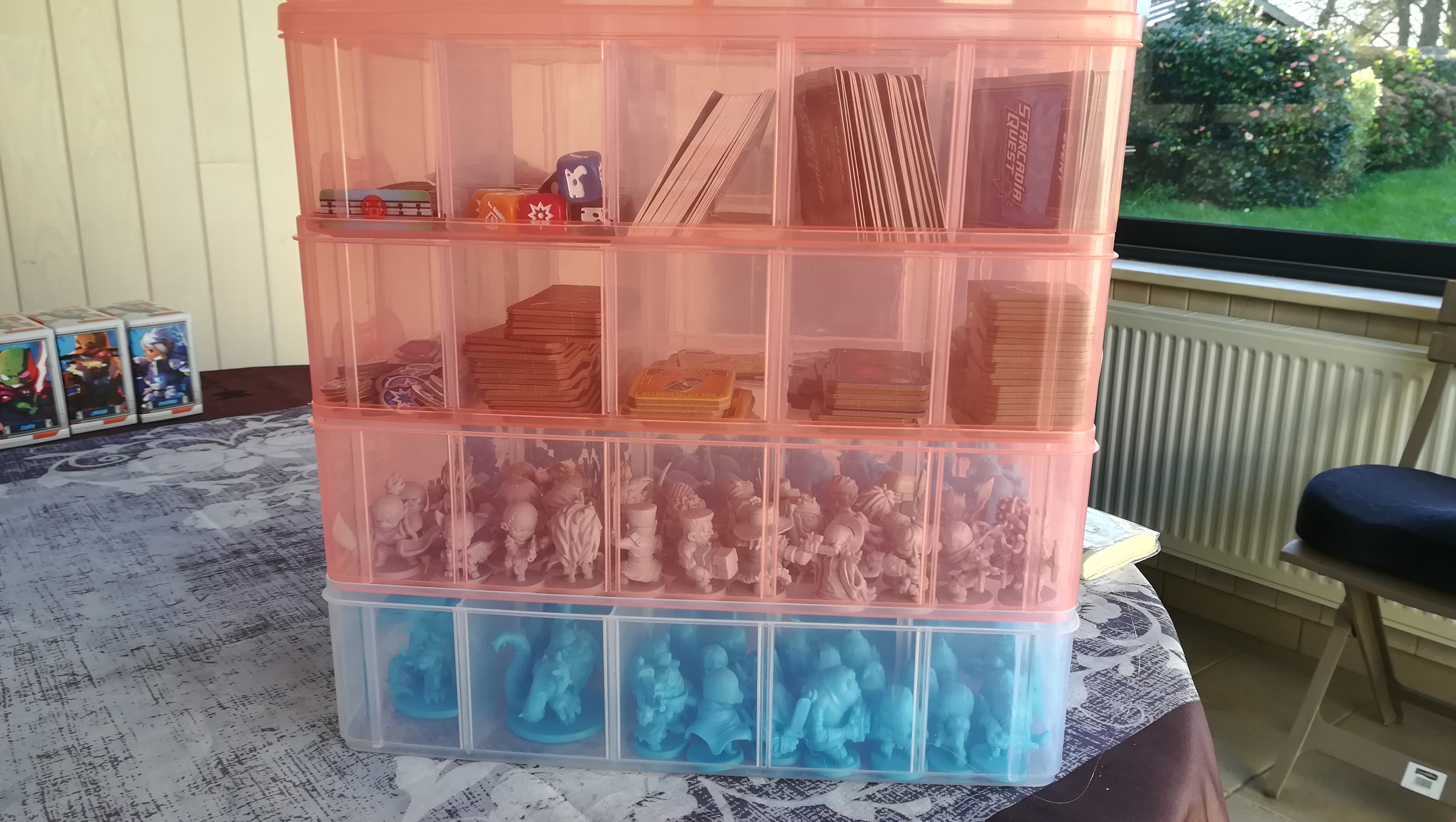 Personnellement pour ce genre de jeu avec figurines (Conan, MBP, JoA…) j’enlève le carton des figurines, et je glisse en dessous des plastiques une partie du matos, soit en sachet soit en boite si ça passe.
