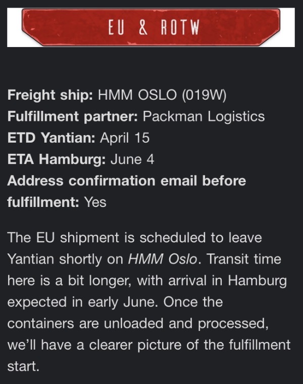 Nos pledges sont sur le bateau. Arrivée prévue en Allemagne début juin :