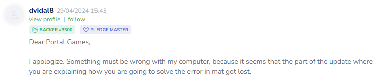 Dans la dernière actu, Ignacy fait son mea culpa pour le playmat, mais pas de SAV en perspective.
