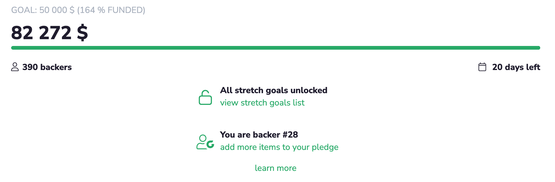 À noter que la page n’est pas finale, l’add-on dinette ayant baissé de 20$ (plus que 39$, maintenant). Du coup, le gros pledge est sensiblement moins intéressant que le moyen plus l’add-on.