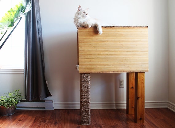 Tu fais la même chose en contre plaqué, ça tiendra tout autant (autant les coussins et grattoires, je conçois que ça puisse s’abimer très vite, mais aucune raison que le chat gratte les planches), et t’en auras pour 20 balles.