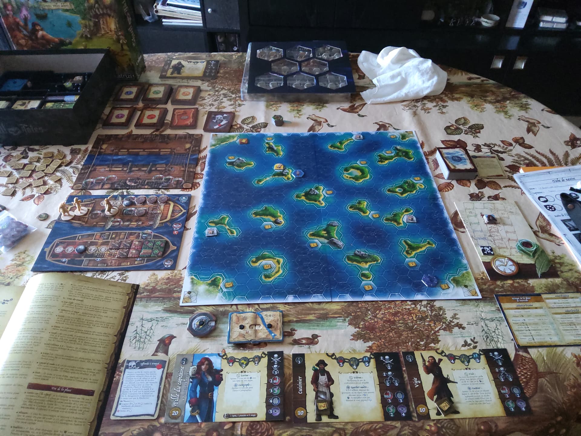 Mais en gros, le gameplay général est : incrémenter l’heure, vérifier si quelqu’un complote, placer les persos et équipage, effectuer les actions de l’endroit où ils se trouvent (dont naviguer), piocher une carte d’événement et on recommence ![]()
