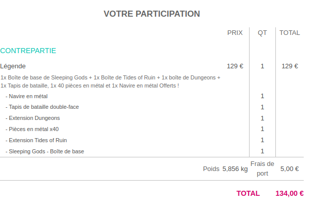 Pour ceux qui ont pledgé All in sur la campagne VF, vous vous souvenez combien on a payé frais de port compris ? Je n’arrive pas à retrouver l’info et rien a été conservé sur gameontabletop ![]()