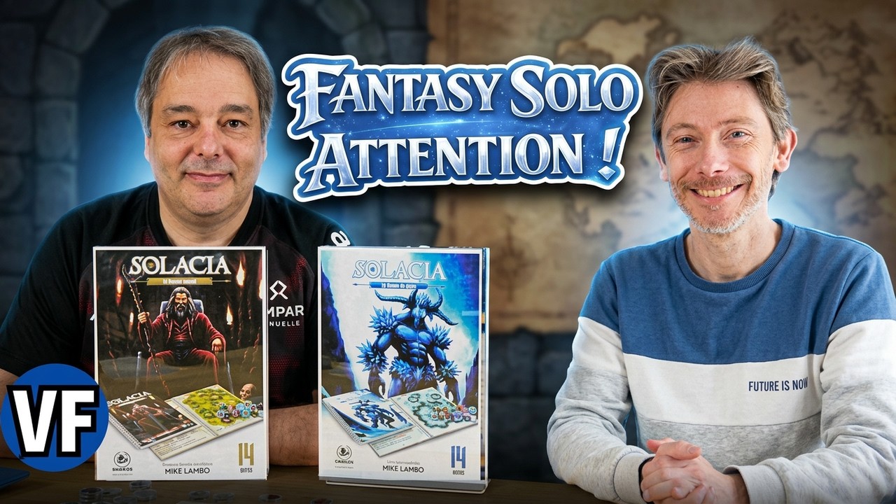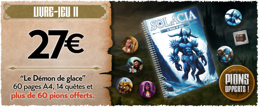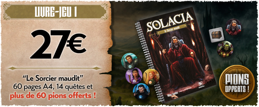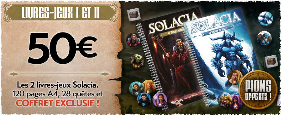 Après avoir publié Sherman Solitaire et Les Aigles, nous vous entraînons maintenant dans le monde fantastique de Solacia ! Ce n’est pas un, mais deux livres-jeux que nous vous proposons pour vivre des aventures palpitantes en solitaire et retrouver les sensations d’un Dungeon Crawler (exploration de donjons). Vous devrez mener votre groupe de 4 héros à la victoire pour chasser les menaces qui pèsent sur le monde de Solacia. Vous pourrez aussi jouer en mode coopératif (en vous répartissant la gestion des héros ) et en mode Duel (arène et seul contre tous).