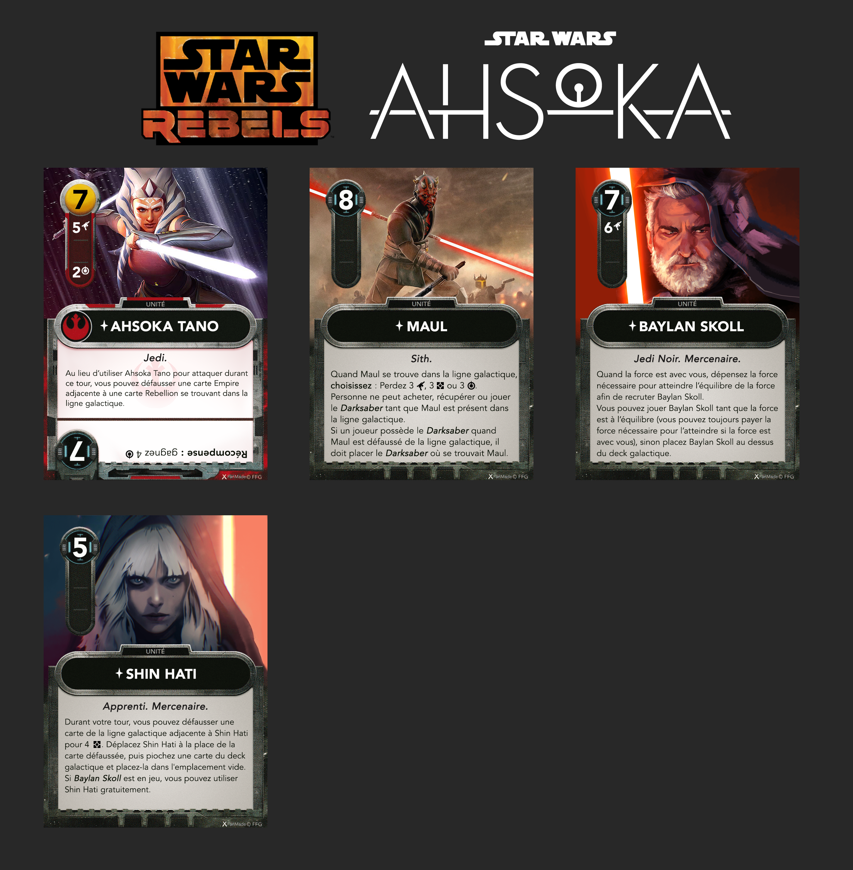 Ici, j’ai tenté des petites choses en terme de design avec la carte Maul, Baylan et Shin.