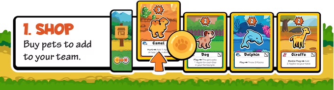 Chaque manche commence par un tour de table où les joueurs achètent des cartes dans la boutique. La boutique regorge d’adorables animaux de compagnie, chacun doté d’une puissance (le nombre de dégâts qu’il inflige au combat) et d’une capacité qui lui permet d’accomplir quelque chose d’inhabituel. La boutique propose également des cartes « nourriture ». Associée à un animal de compagnie, la nourriture peut offrir des avantages permanents ou des bonus ponctuels très puissants !