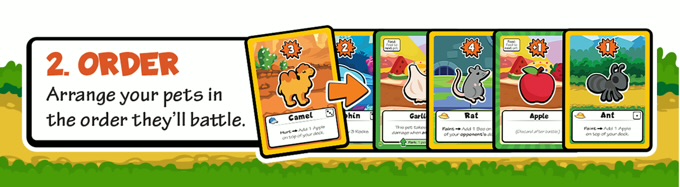 Une fois que les joueurs ont récupéré leurs cartes, ils forment secrètement une équipe. Les joueurs décident de l’ordre dans lequel leurs animaux vont se battre et attribuent la nourriture de leur choix à leurs animaux. Savoir dans quel ordre placer vos animaux, quelle nourriture leur attribuer et comment maximiser leurs capacités de manière astucieuse, voilà ce qui rend ce jeu si amusant !