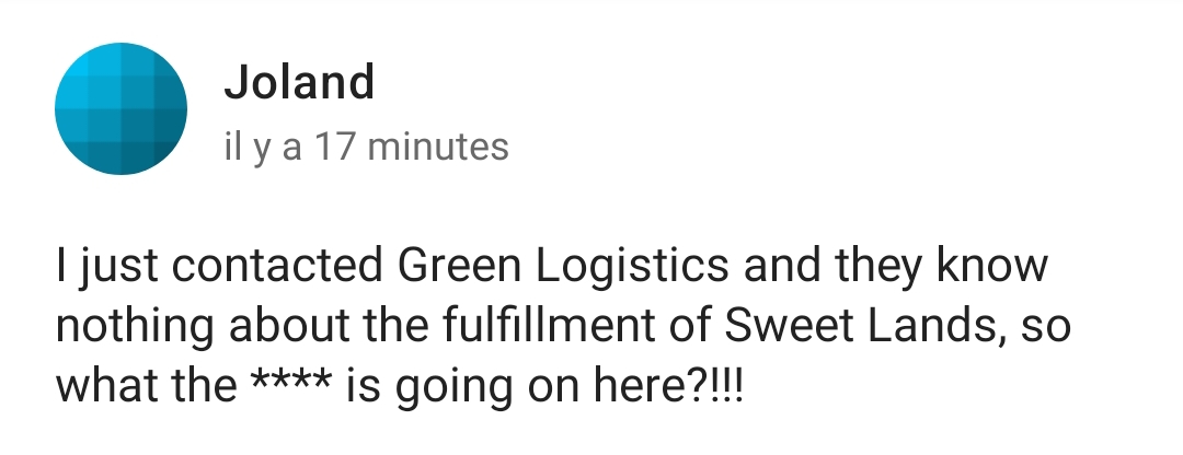 J’étais étonnée qu’on parle de Green Logictics. Car je pensais que nos boites allaient être livrées par Happy Shops. Peut-être qu’il y a eu un malentendu. D’ailleurs c’est @Biluxo qui en parle, sa boite a été livrée par Happy Shops.