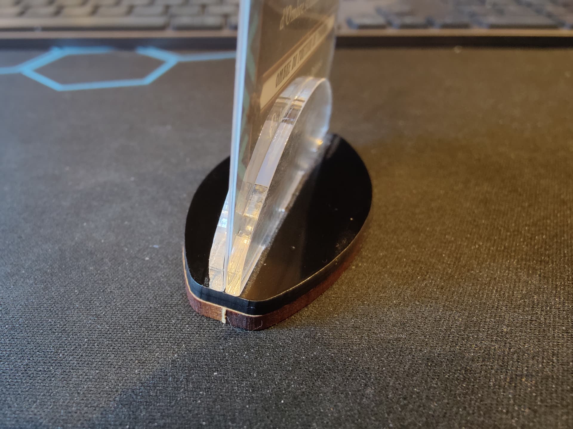 Il faut que je retrouve ça, mais est un support lourd avec 2 petit « panneaux » en acrylique qui prennent la carte en sandwich.