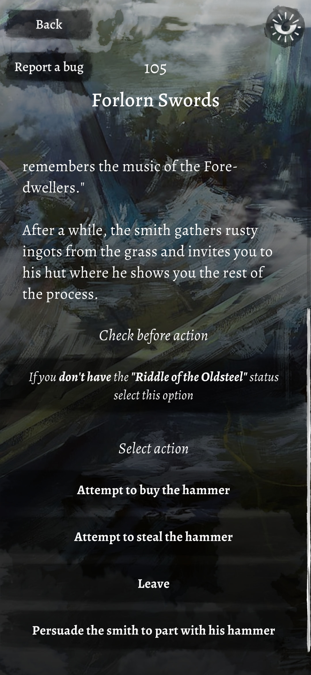 Je n’ai toujours pas l’action de persuader le forgeron, la preuve en image où il manque une option par rapport au livre papier.