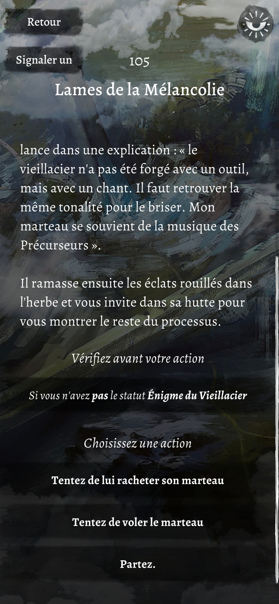 Tu as le journal 2.0 alors que l’appli en VF n’est pas (encore ?) en 2.0… J’ai vérifié en VO avec l’appli où il y a le choix de la version et sur la carte 105 en 2.0 on peut lui demander son marteau si on a beor mais en 1.0 on peut pas non plus. Donc ce n’est pas un bug de l’appli mais une évolution avec la nouvelle version.