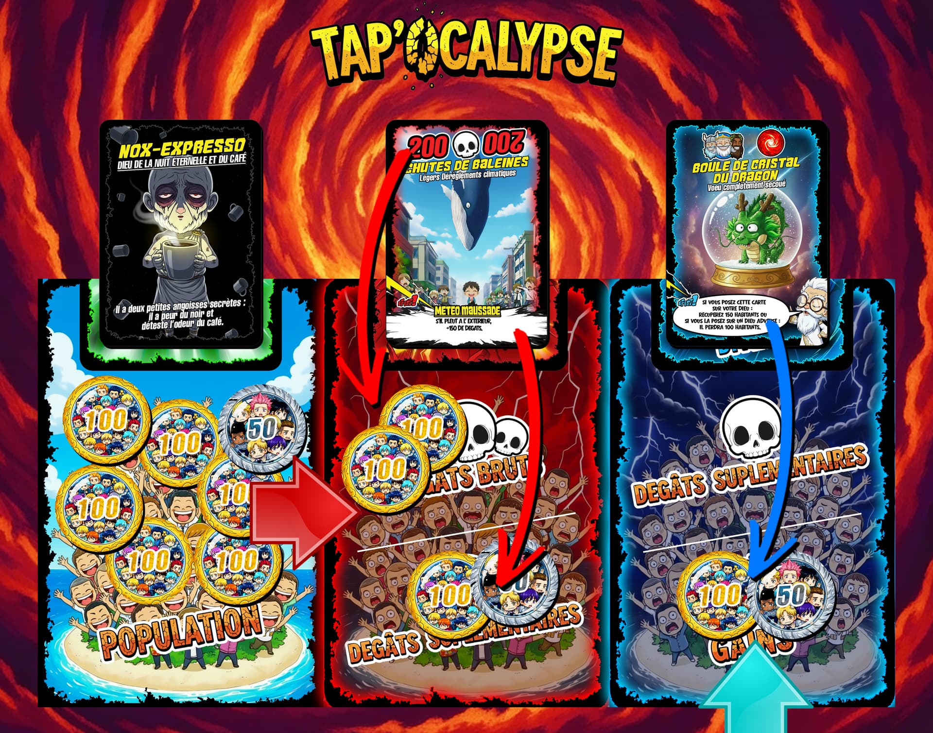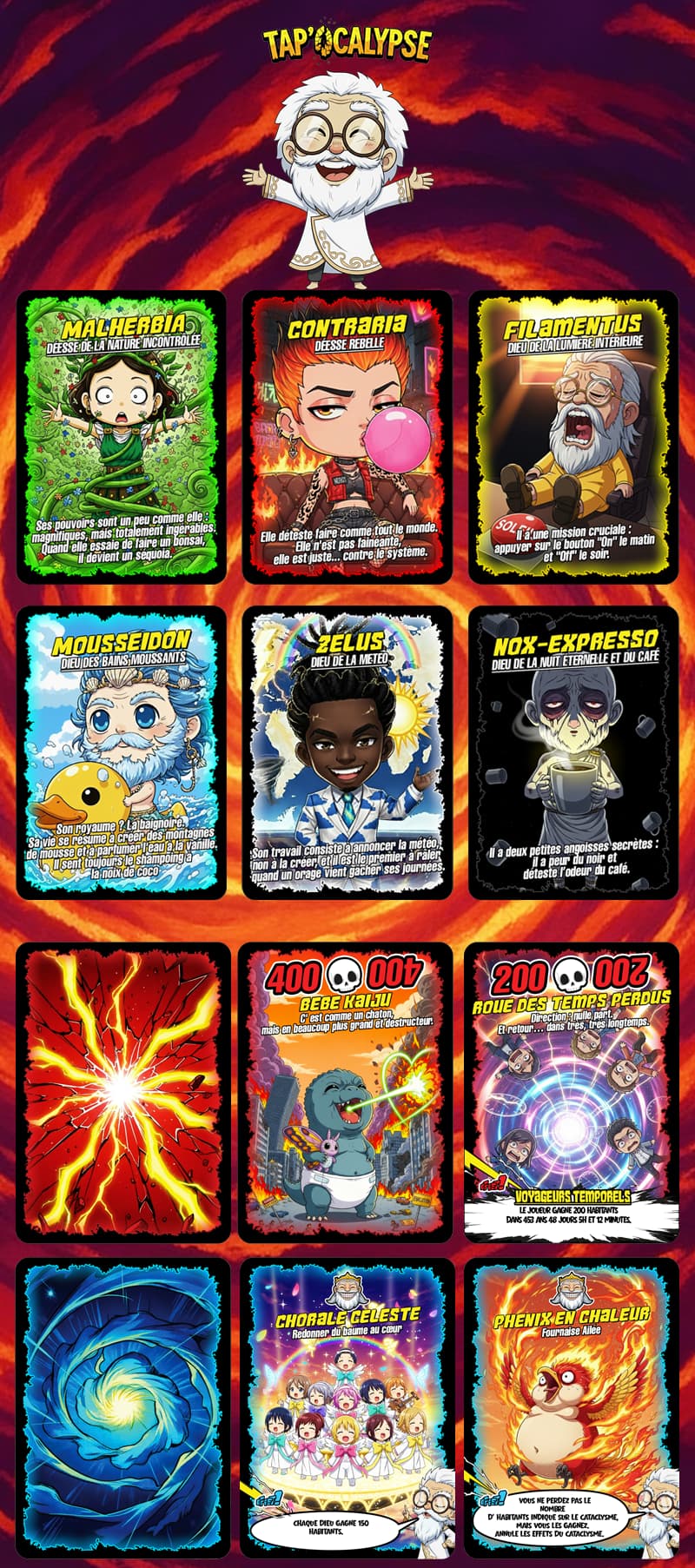 Nous, les Dieux établis, avons la solution : pour égayer nos millénaires, nous avons créé un jeu ! Il s’appelle Tap’ocalypse ! Une petite guerre divine entre amis, ça ne se refuse pas ? Et le meilleur dans tout ça ? Nous utilisons nos pions favoris : les mortels !