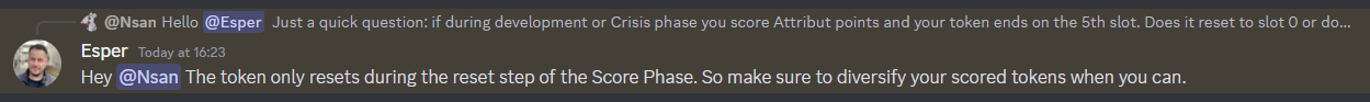 Dans le livret, page 22, il est dit que l’on remet notre meeple sur la case 0 à la fin de la phase score. Mais que se passe t’il si en gagnant des PA pendant la phase de Développement et/ou Crise on atteint le 5e rang ? Le meeple reste t’il en place jusqu’à la fin de la phase de Score ou revient t’il sur la case 0 ?