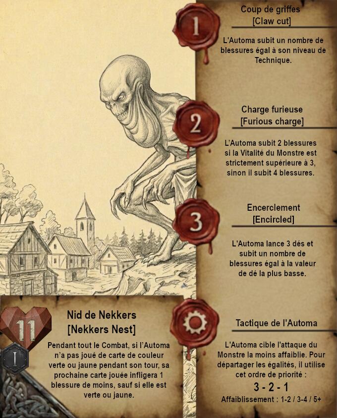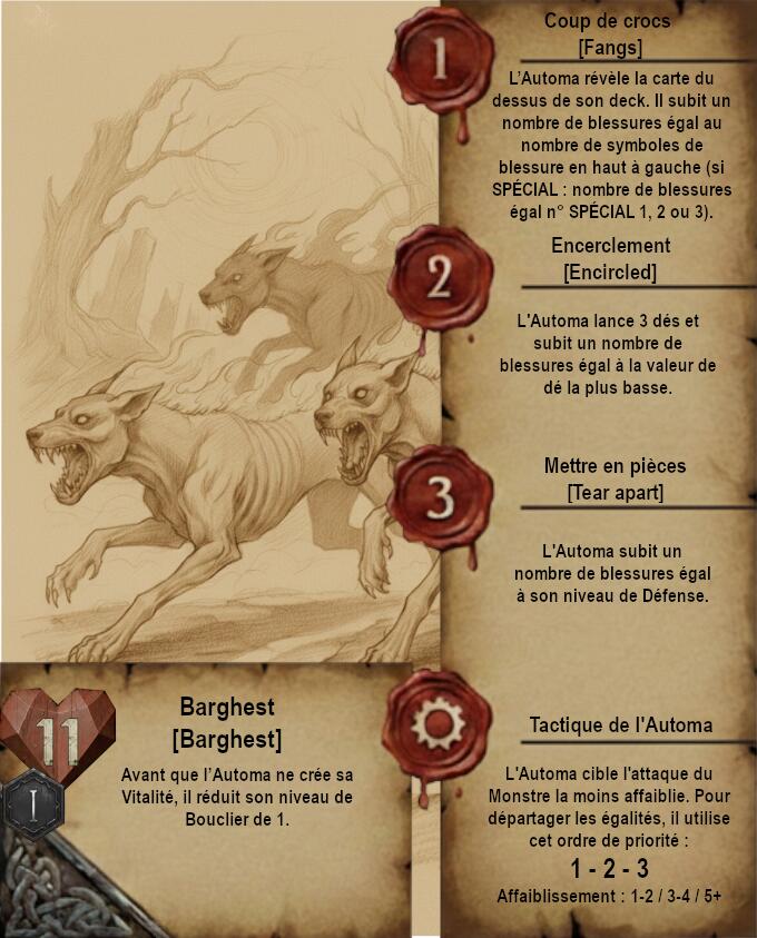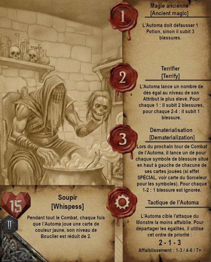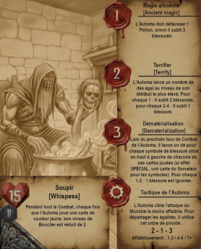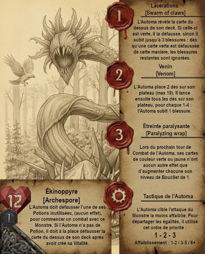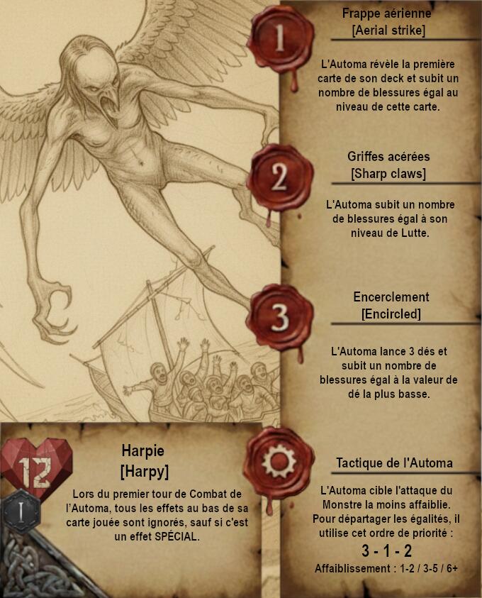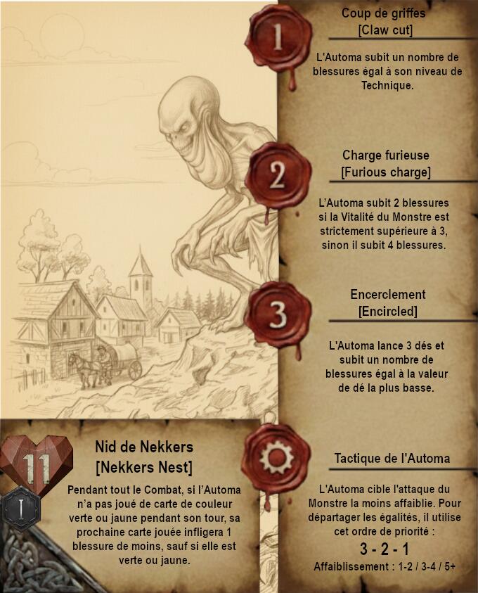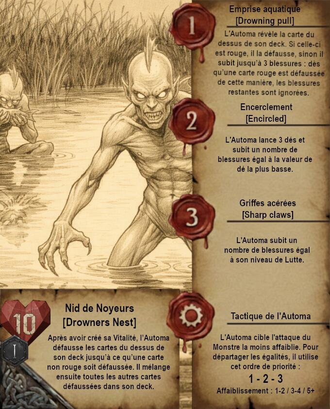Je vous propose donc quelque chose de très différent avec des cartes dans un format qui ferait un peu vieux livre de Sorceleur avec pages jaunies et dessins faits à la main (Ces dessins sont faits via IA je précise). Le A de l’Automa est remplacé par un engrenage et le H de Humain par 2 épées.
