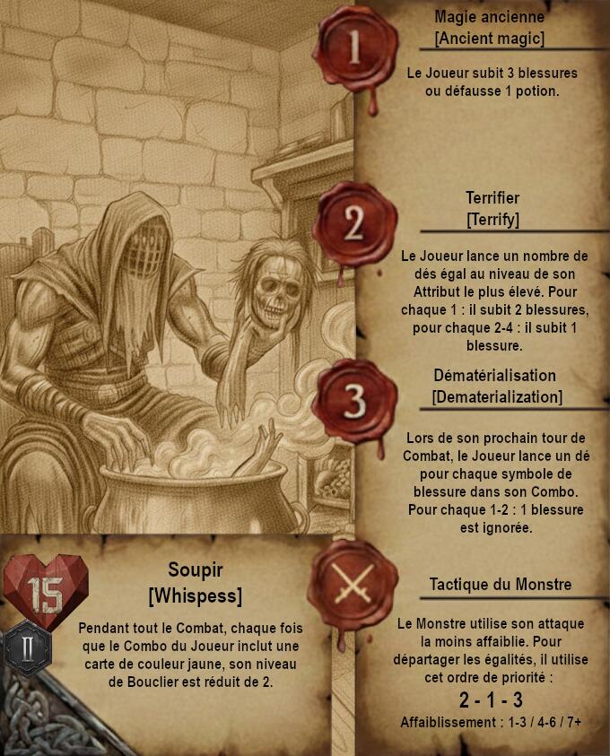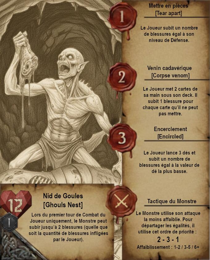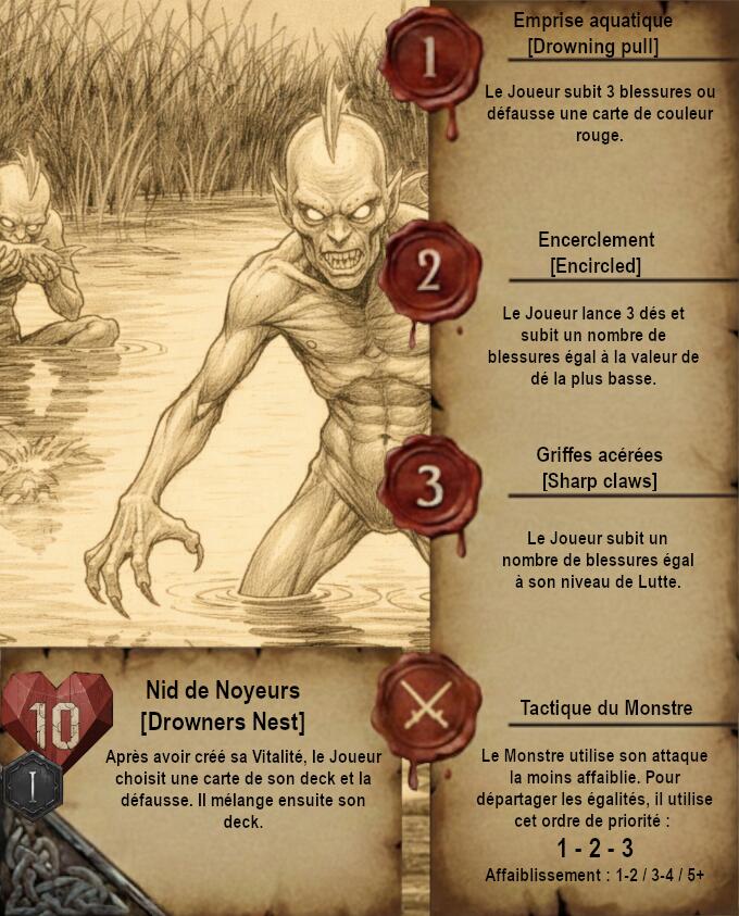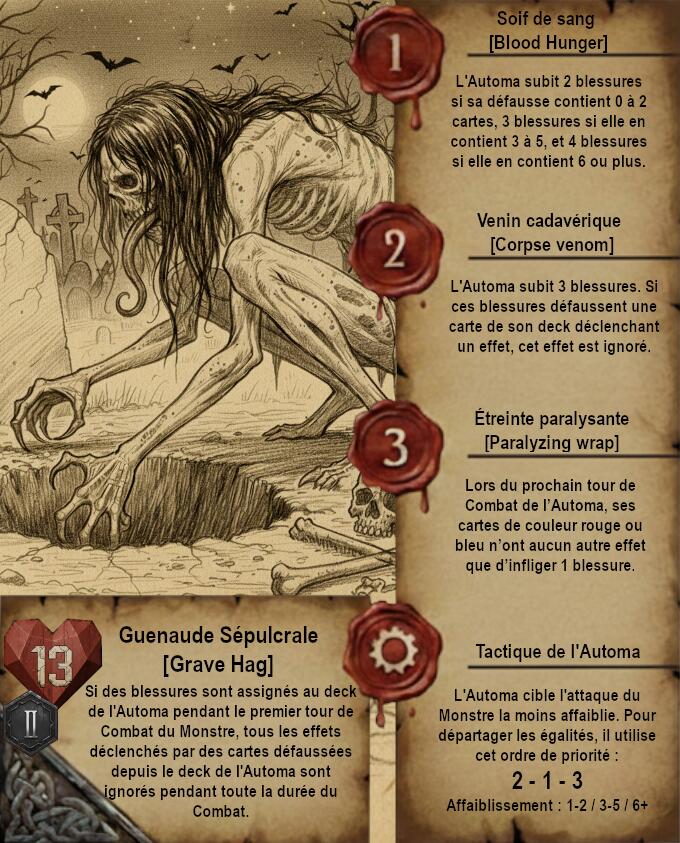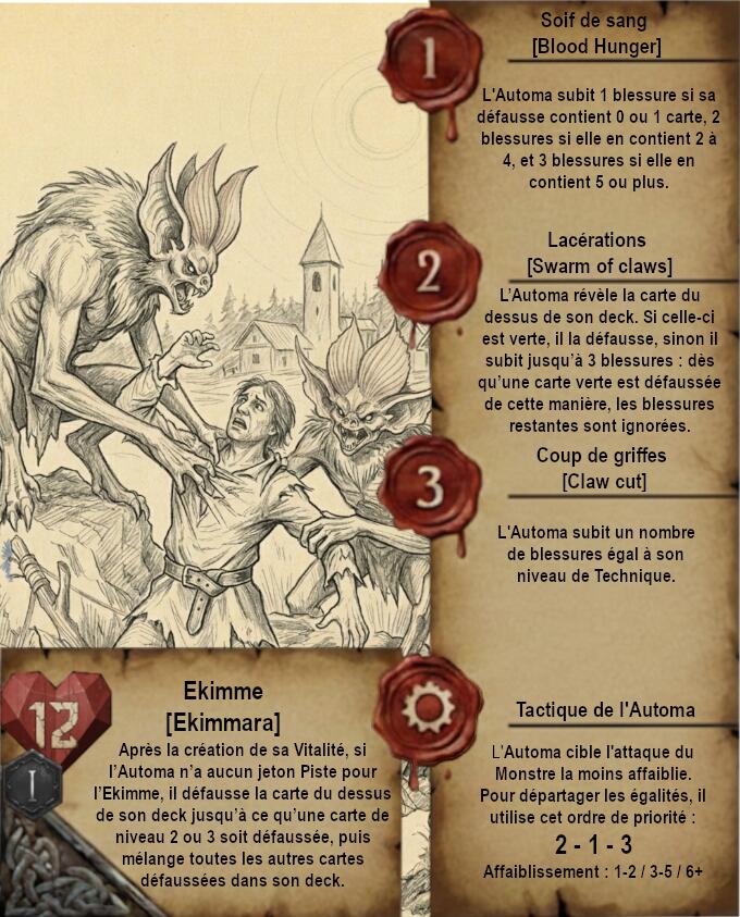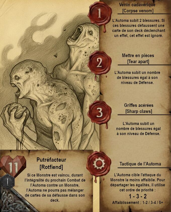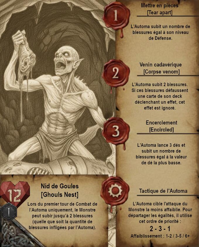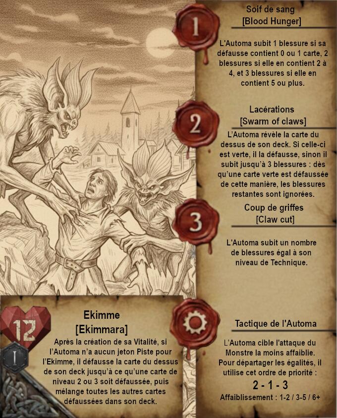 Je vous propose donc quelque chose de très différent avec des cartes dans un format qui ferait un peu vieux livre de Sorceleur avec pages jaunies et dessins faits à la main (Ces dessins sont faits via IA je précise). Le A de l’Automa est remplacé par un engrenage et le H de Humain par 2 épées.