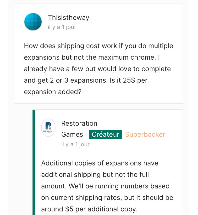 J’ai demandé vite fait ce qui se passerait quand même si il y avait une commende de 10-15 set complet : ils ne savent pas mais pense qu’il pourrait y avoir des sortes forfait d’expédition par « palier de poids »