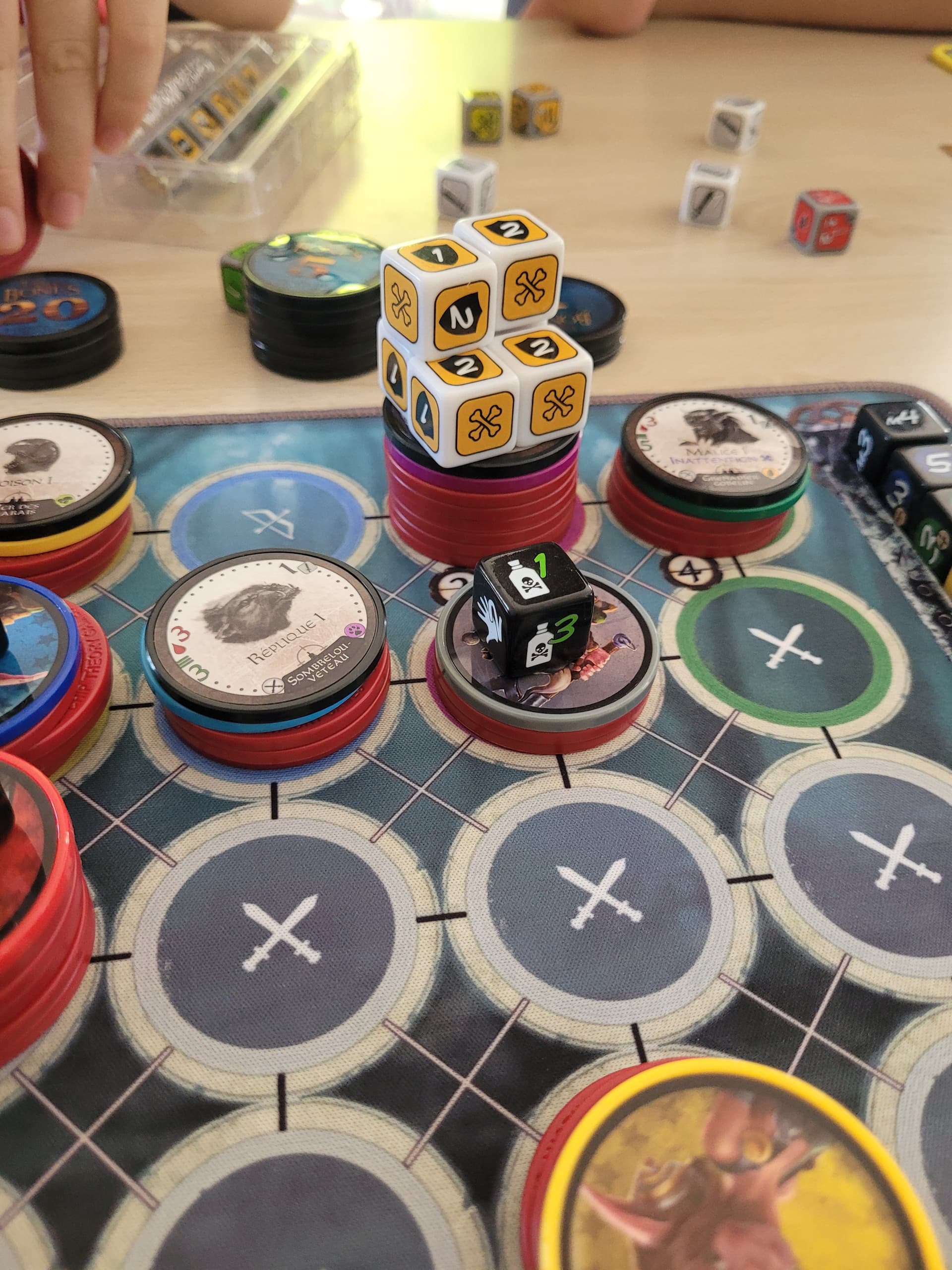 S’il a 2 dés de défense à lancer, dès qu’il a 2 dés de défense de positionné sur son jeton, il n’en lance plus. Si il en avait qu’un seul de positionné sur son jeton, il en lancerait plus qu’un seul. Chaque fois que c’est au tour du vilain de jouer, tu vérifies et tu lances le nombre de dés en fonction. S’il est trop loin d’un gearloc après son mouvement, il n’attaque pas mais lance quand même ses dés de défense s’il y a lieu de les lancer.