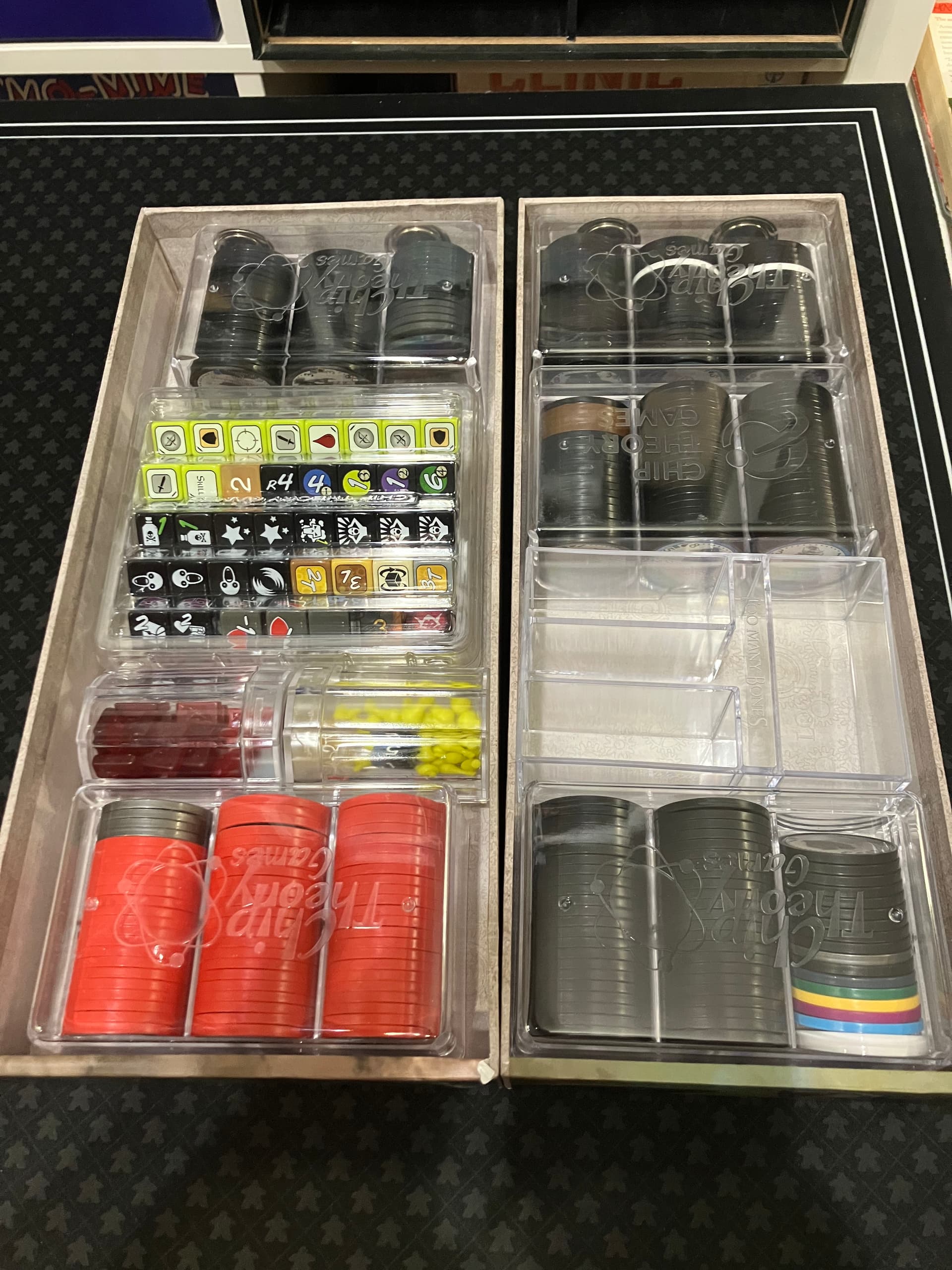 D’expérience, ça va limite plus vite de parcourir 2 rangées de jetons pour prendre les bons types puis séparer par valeur que de vouloir tout bien ranger tout le temps. (j’ai supprimé les sticker et les séparateurs, j’ai l’impression d’avoir agrandit l’espace).