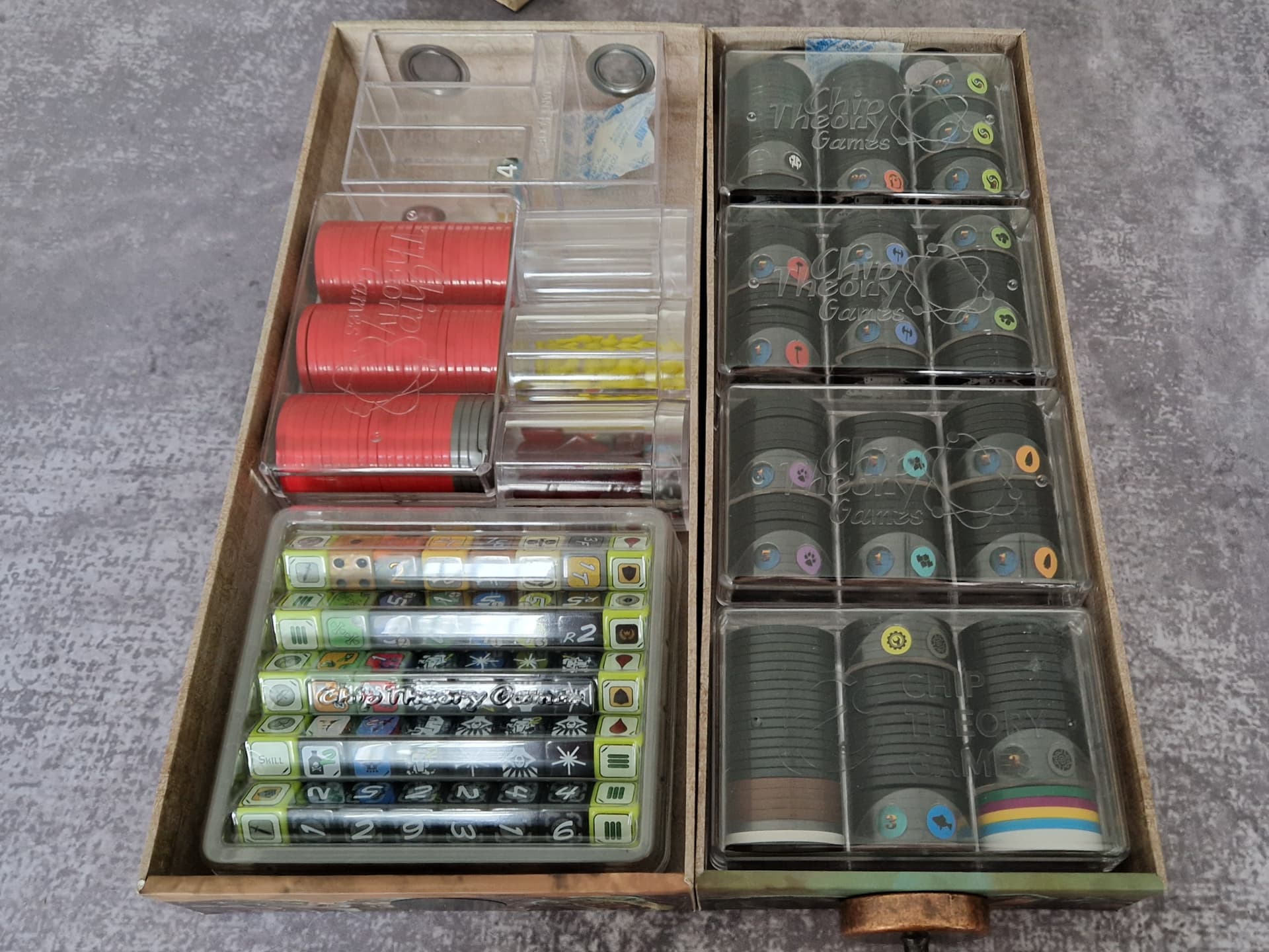Pour les jetons, j’ai mis par boites (base, undertow, unbreakable, 40 days x 3) en séparant un peu comme ça veut bien. Je met pas les séparateurs transparents qui prennent de la place pour pas grand chose, je préfère utiliser les jetons blancs compte tour pour les deux séparations qu’il me restait à démarquer (limites entre deux extensions).