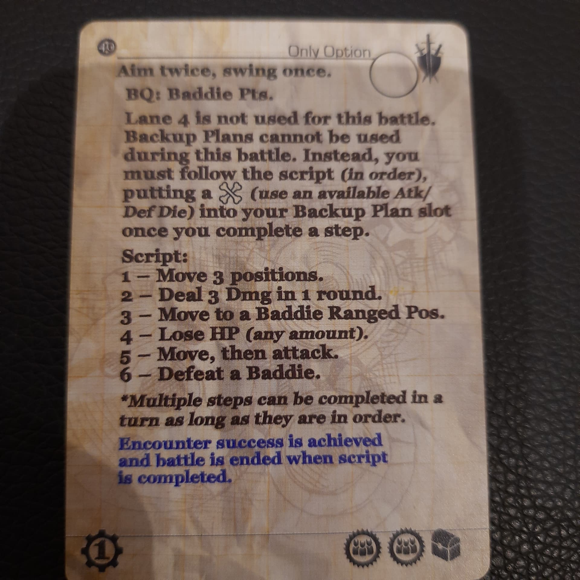 Question, en découvrant la carte solo 6 de 40 jours en Daelore : il n’y aurait pas un problème de traduction sur le script numéro 2 « Infligez 3 dégâts pendant la manche 1 » ?