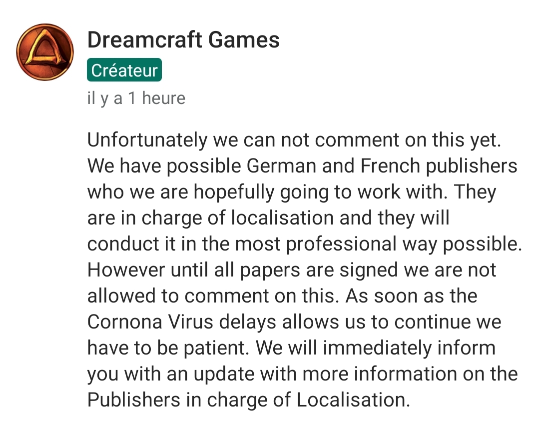 We are working with renowned distributors on localizing the game for the German and French market (separate distributors). Due to the Corona Virus, our agreements are taking much longer than expected and are not yet concluded. Therefore, we are not allowed to mention the name of the distributors yet. As soon as we can, we will announce everything. However, rest assured that the quality of the translation is really important to us!