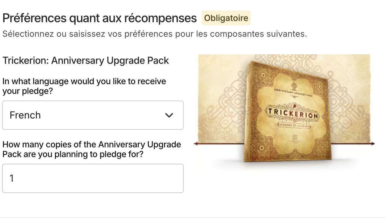 C’est parti pour le pledge manager. J’ai fait un essai, les fdp sont de 16 € (HT) pour un all-in (avec un jeu de pièces en plus, les tokens en bois et le playmat). Si j’ajoute une édition anniversaire, ça ajoute 7 € (HT), donc on gagne un peu en se groupant mais ça reste faible comme prévu.