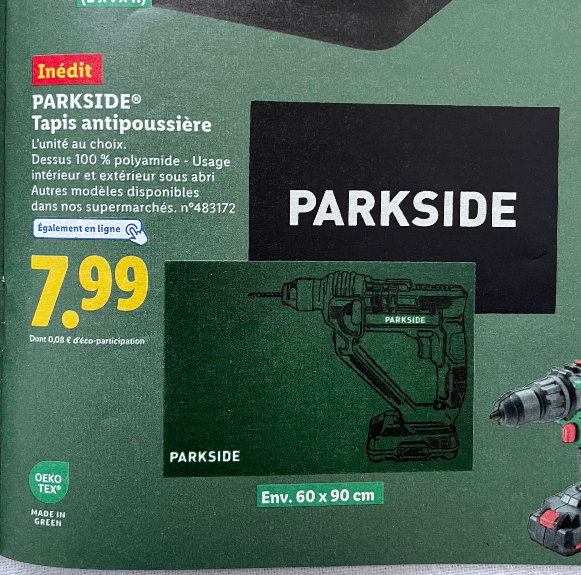 J’ai pris un tapis Parkside : c’est de la moquette, donc à voir à l’usage si c’est vraiment pratique. Au pire ça me servira quand je perce des trucs ^^