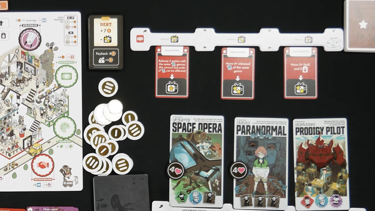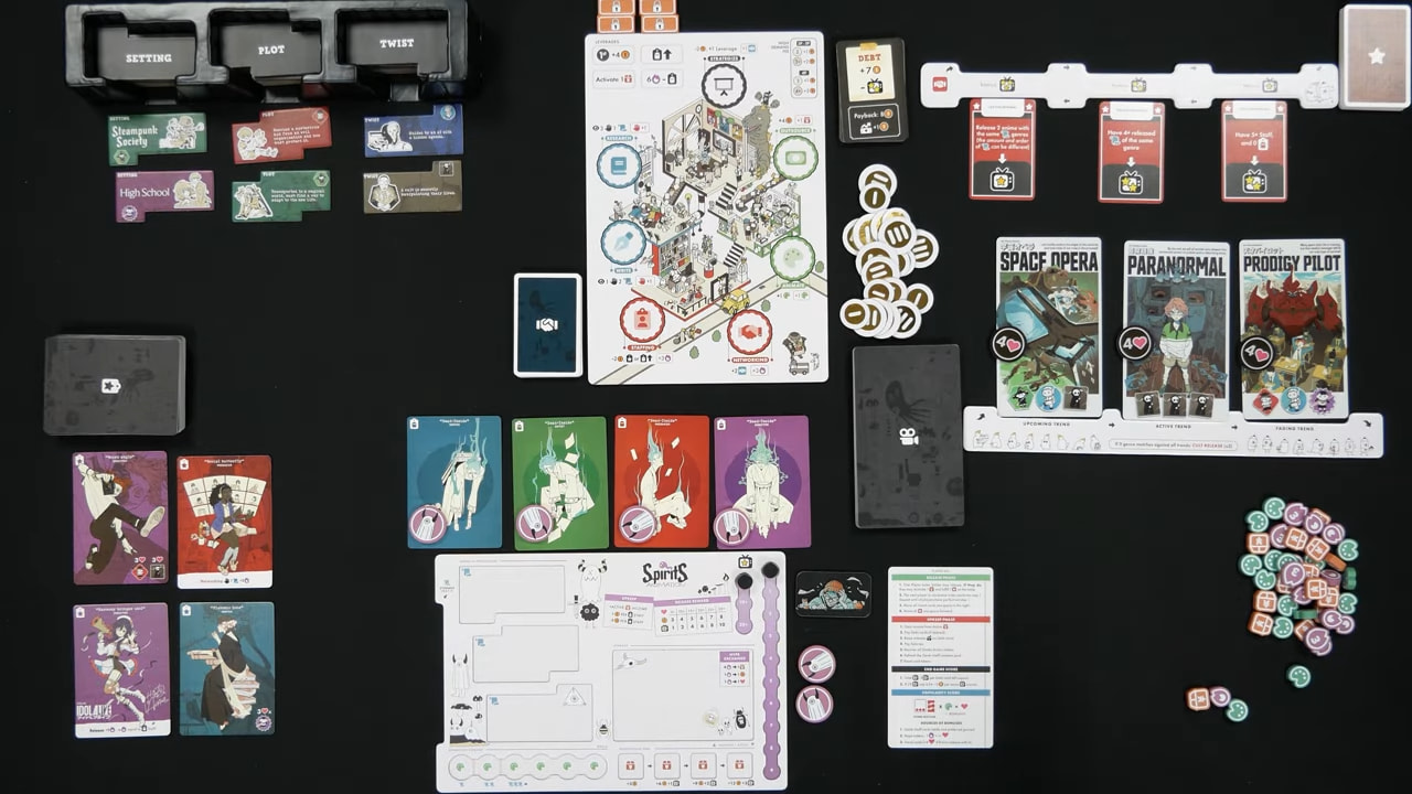 Notre histoire débute au Japon où un gros studio d’animation a fait faillite laissant des centaines d’employés sur le carreau et vous, jeunes cadres dynamiques, avez décidé de former des studios et de récupérer tout ce beau monde pour créer les meilleurs animes possibles ! À l’issue des 4 manches, celui qui a gagné le plus de points de réputation remporte la partie, en cas d’égalité, le joueur avec le plus d’argent est déclaré vainqueur.