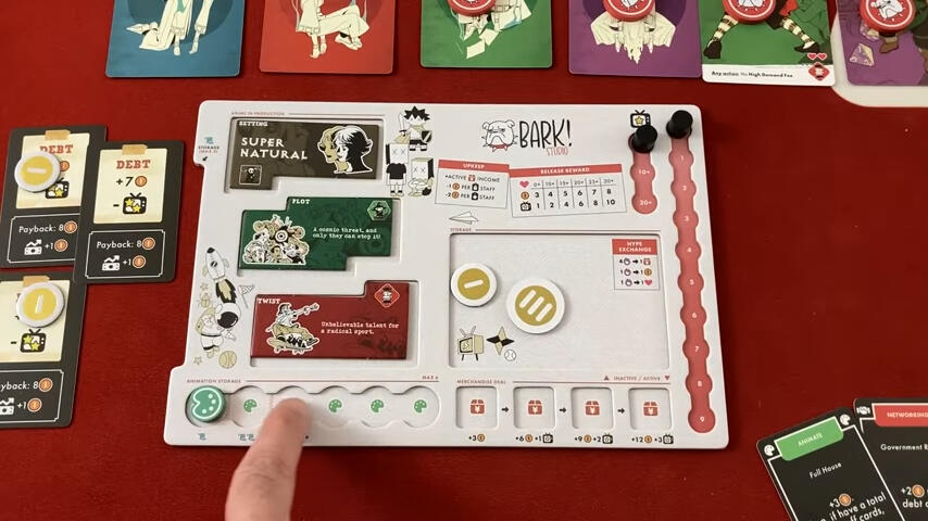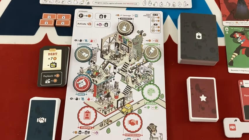 Chaque joueur commence par récupérer un plateau de jeu et les 4 mêmes personnages fantômes (des employés virés) comprenant un scénariste, un producteur, un réalisateur et un artiste sur lequel il placera 4 de ses 6 jetons à l’effigie de son studio et gardera les 2 autres proches de lui. Après avoir désigné le premier joueur, chaque joueur recevra 3, 4,5 ou 6 pièces dans l’ordre du tour qui vous permettra essentiellement de payer des actions pour le jeu. Par défaut, vous commencez avec une carte dette dès le début de la partie (il est possible de la retirer pour jouer en mode facile).