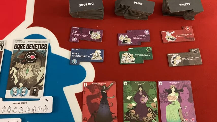 Chaque carte Tendance possède 3 logos (unique, double, triple) répartis en 5 catégories (science fiction, horreur, tranche de vie, fantaisie et action) qui vous indiquera ce qui est attendu. Par exemple, le Space Opera demandera 1 Fantaisie, 1 Science fiction et un horreur, le Period Drama, 2 Tranches de vie et 1 Fantasie tandis que le Paranormal demandera 3 Horreurs.