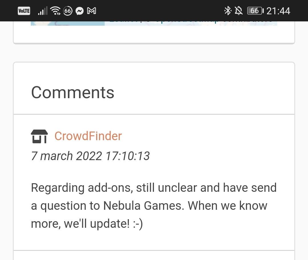 Je suis assez insatisfait de la politique d’Orange Nebula concernant les Rifts. Déjà qu’il y a peu de SG dans leur campagne, c’est bête de les faire payer à ceux qui upgradent leur pledge dans le PM. Sans cela, j’aurais probablement craqué, et pris le Nebula dans le PM. Mais en l’occurence, je pense que je vais me contenter du minimum et descendre mon pledge à 1$.