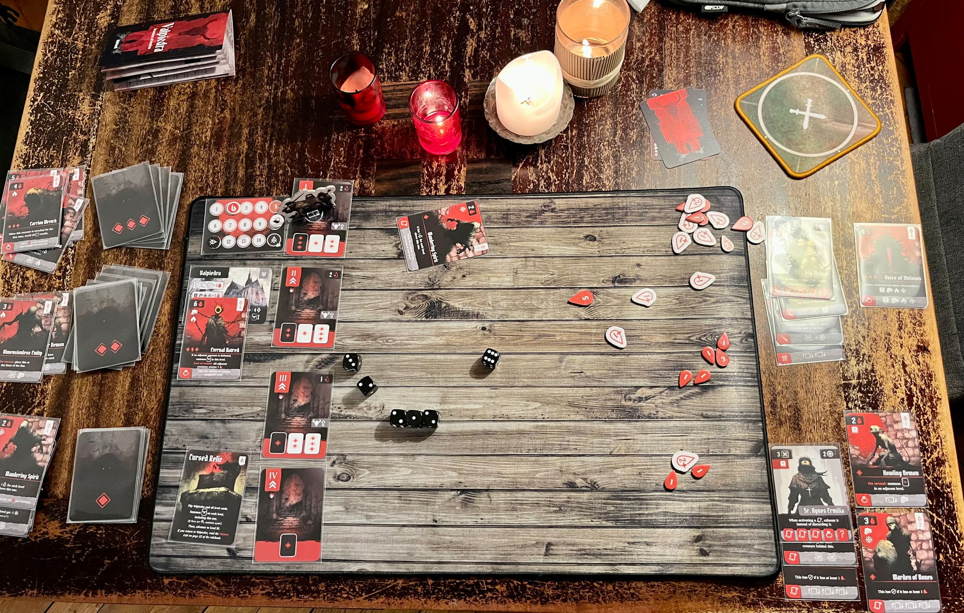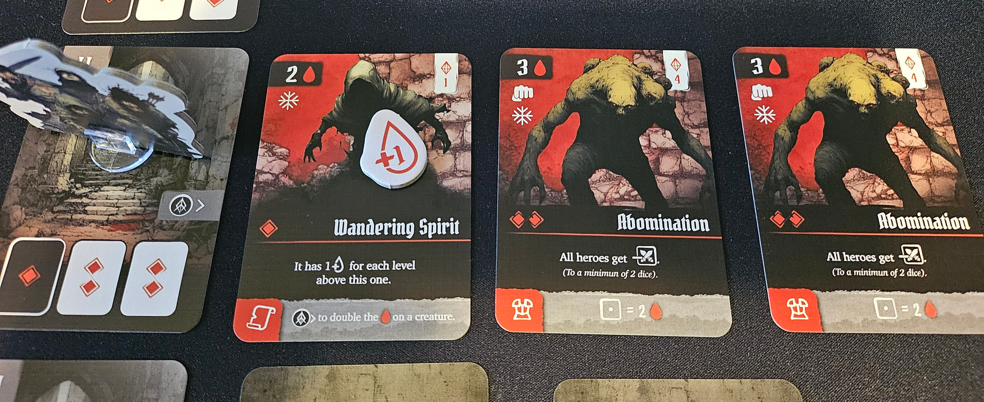 On pourrait le comparer à Dark Souls, tellement il est difficile. Il y a deux choses qui le rendent presque injouable: la chatte aux dés et la chatte aux cartes ! Deux facteurs chance sur lesquels tu peux mitiger le résultat, mais ça reste, de manière générale, très dur. Mais surtout, ce sont les deux mécaniques principales du jeu ! Donc, dès le premier niveau, si la chance n’est pas, un minimum avec vous, les blessures encaissées pèseront lourd dans les prochains niveaux. La santé est partagée entre tous les héros et chaque monstre blessé mais non tué, riposte automatiquement et vous inflige une blessure. Avec deux héros, on commence avec 5 points de santé.